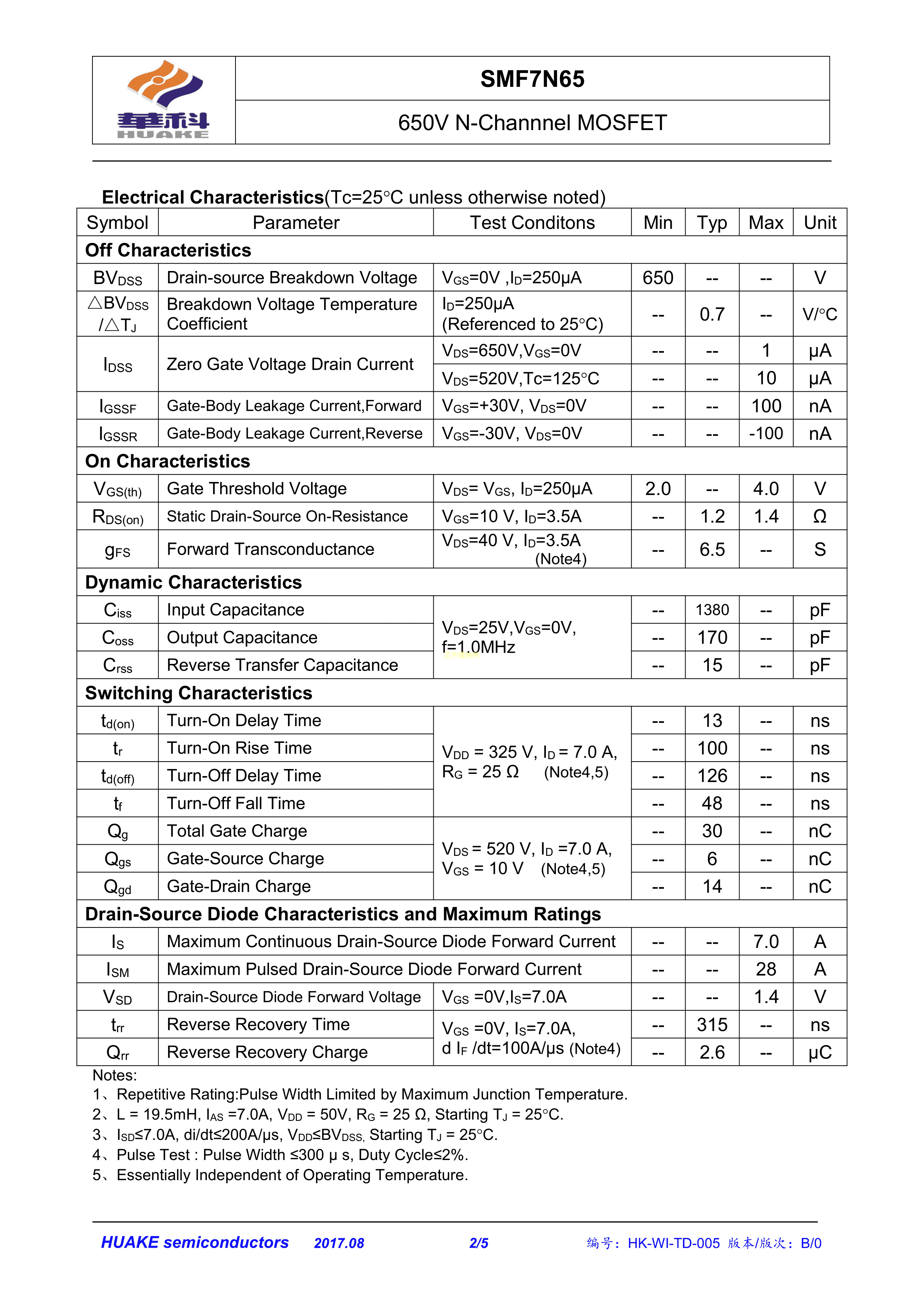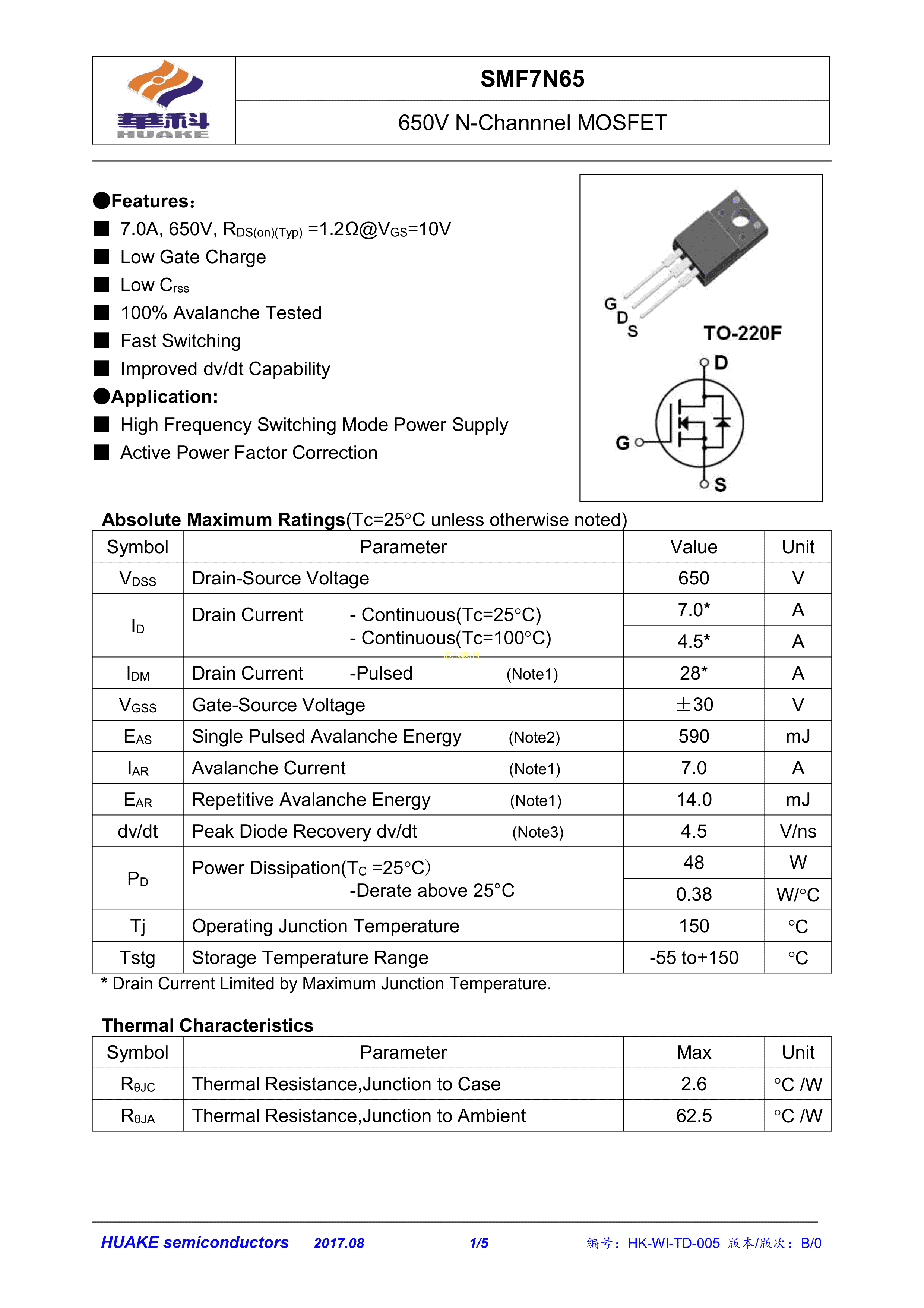SMF7N65数据手册TO-220F封装HUAKE(华科)PDF规格书,中英文下载