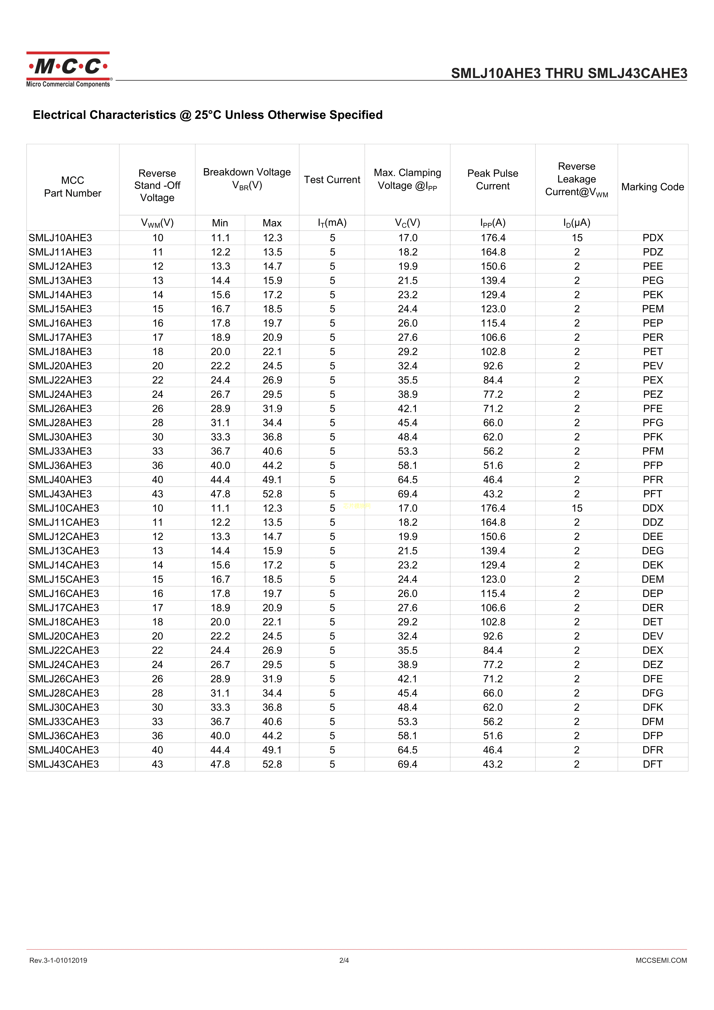 SMLJ33AHE3-TP数据手册SMC封装MCC(美微科)PDF规格书,中英文下载