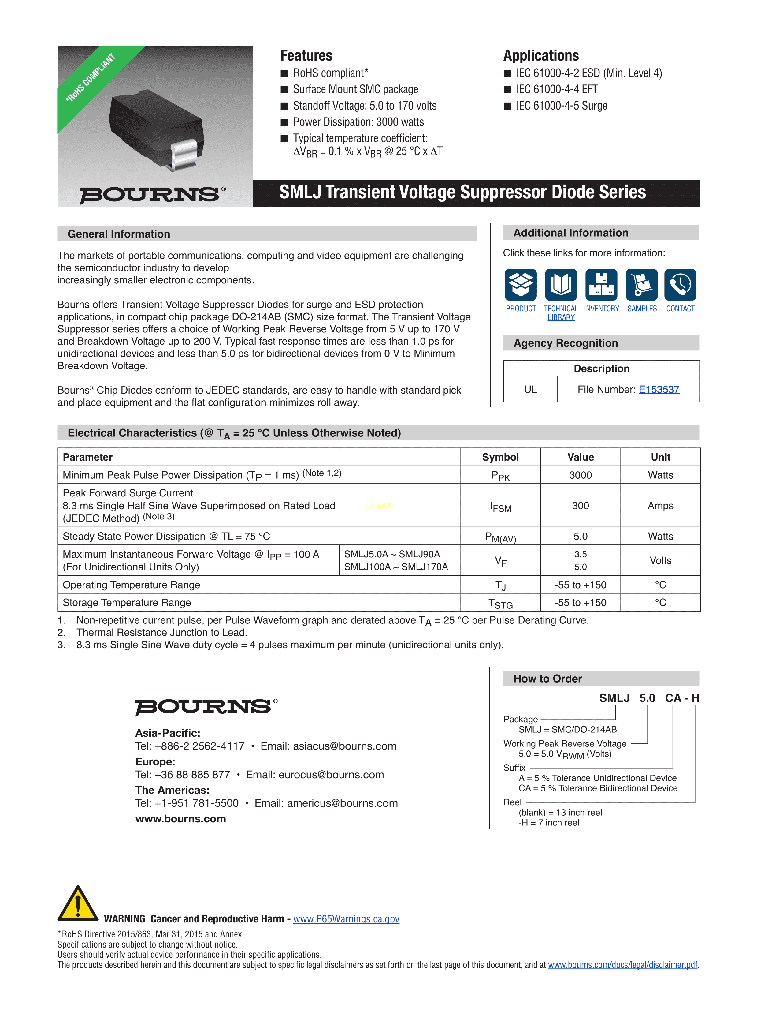 SMLJ45A数据手册SMC(DO-214AB)封装BOURNSPDF规格书,中英文下载