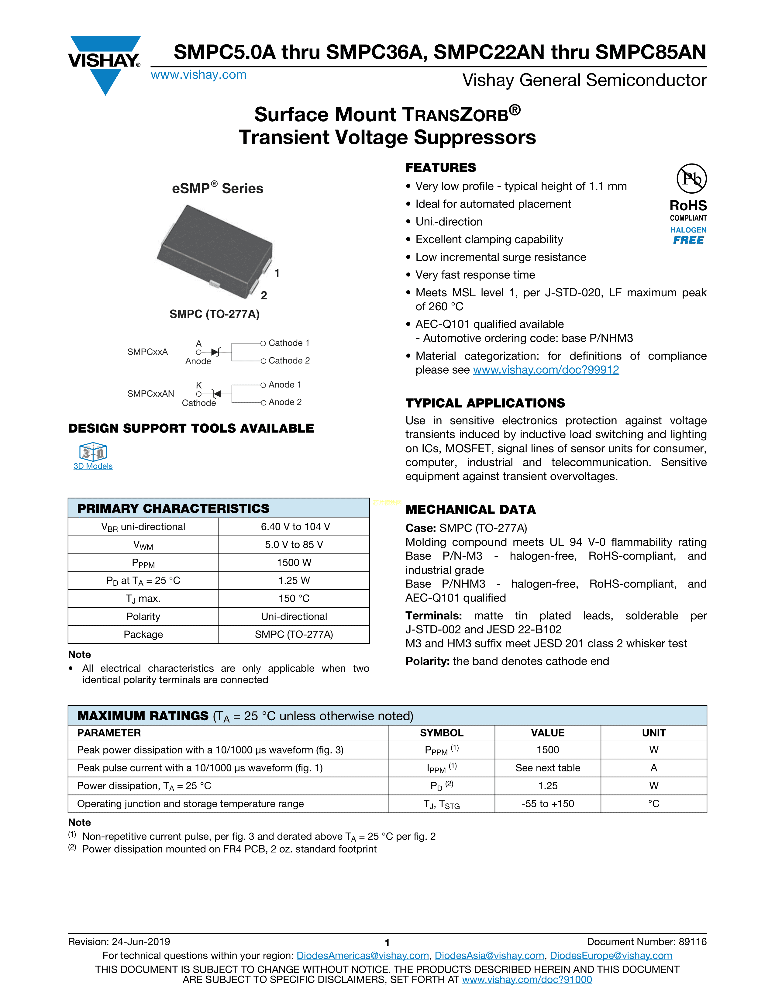 SMPC70ANHM3-H数据手册TO-277A(SMPC)封装VISHAY(威世)PDF规格书,中英文下载