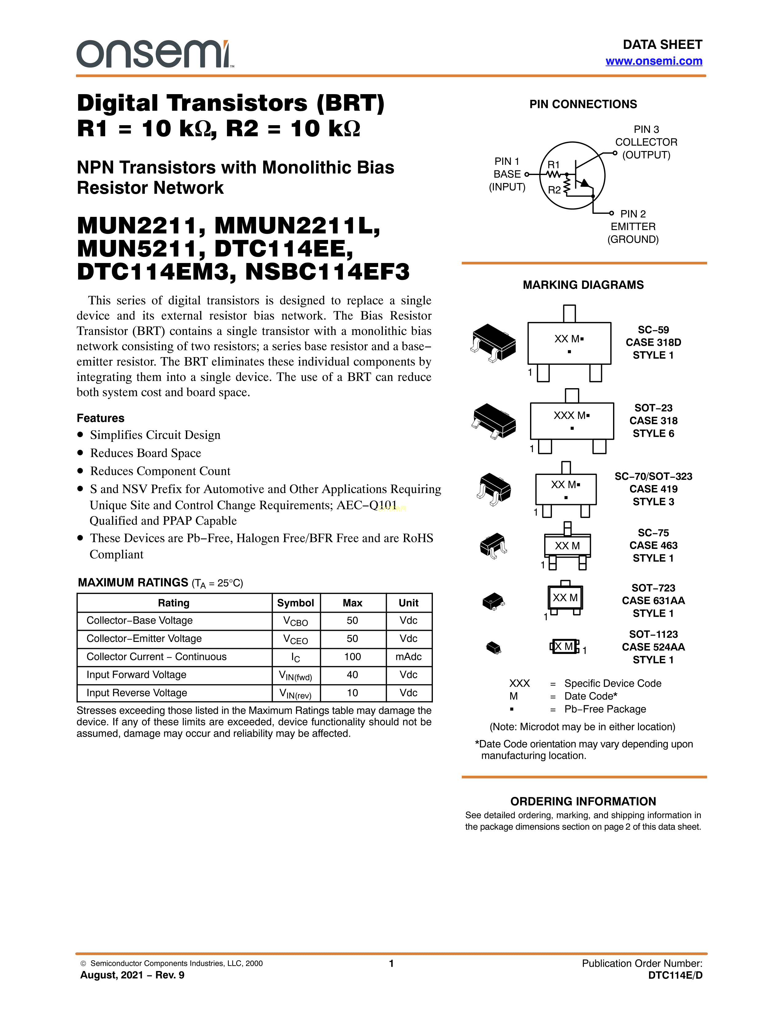 SMUN2211T1G数据手册SC-59封装onsemi(安森美)PDF规格书,中英文下载