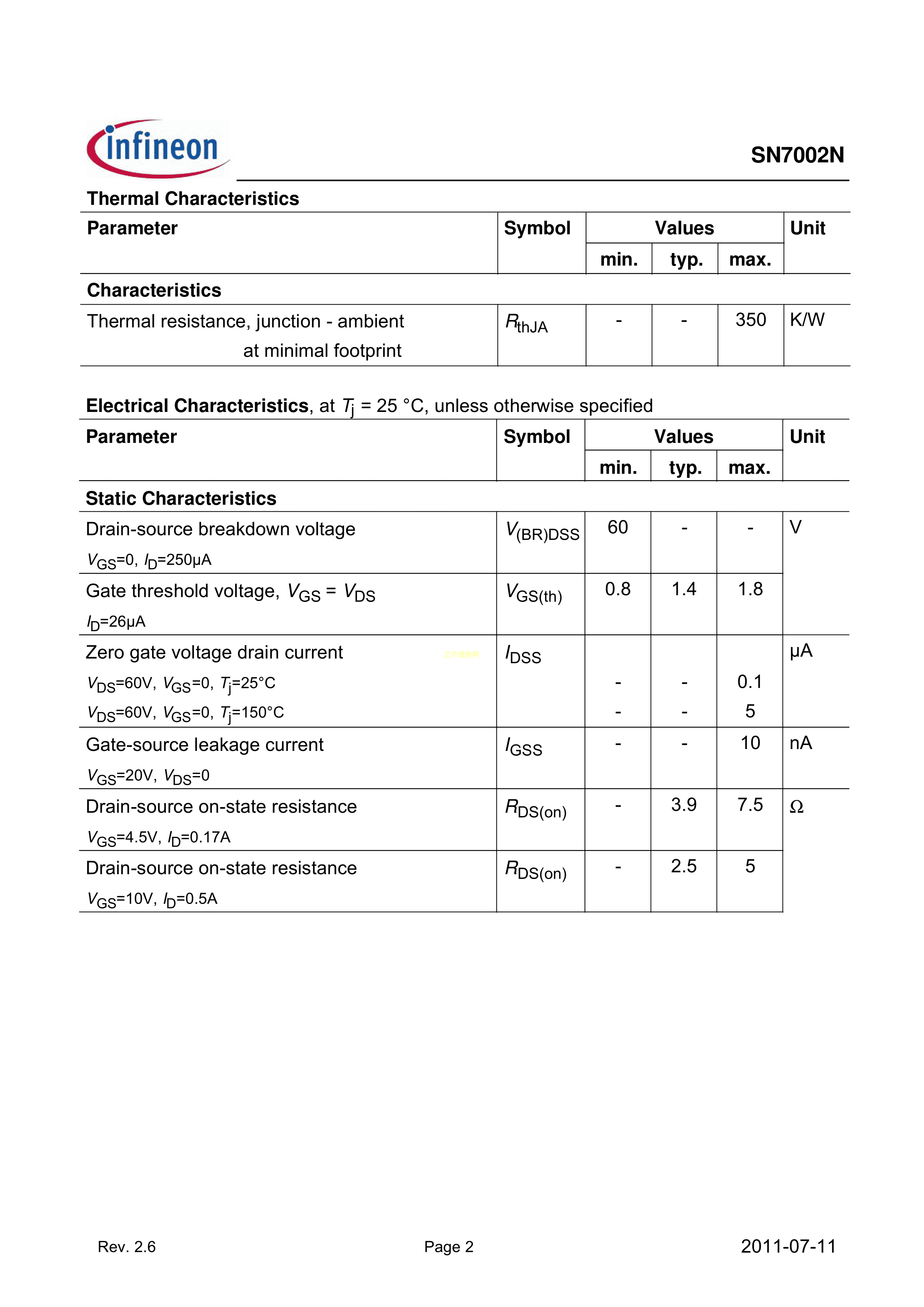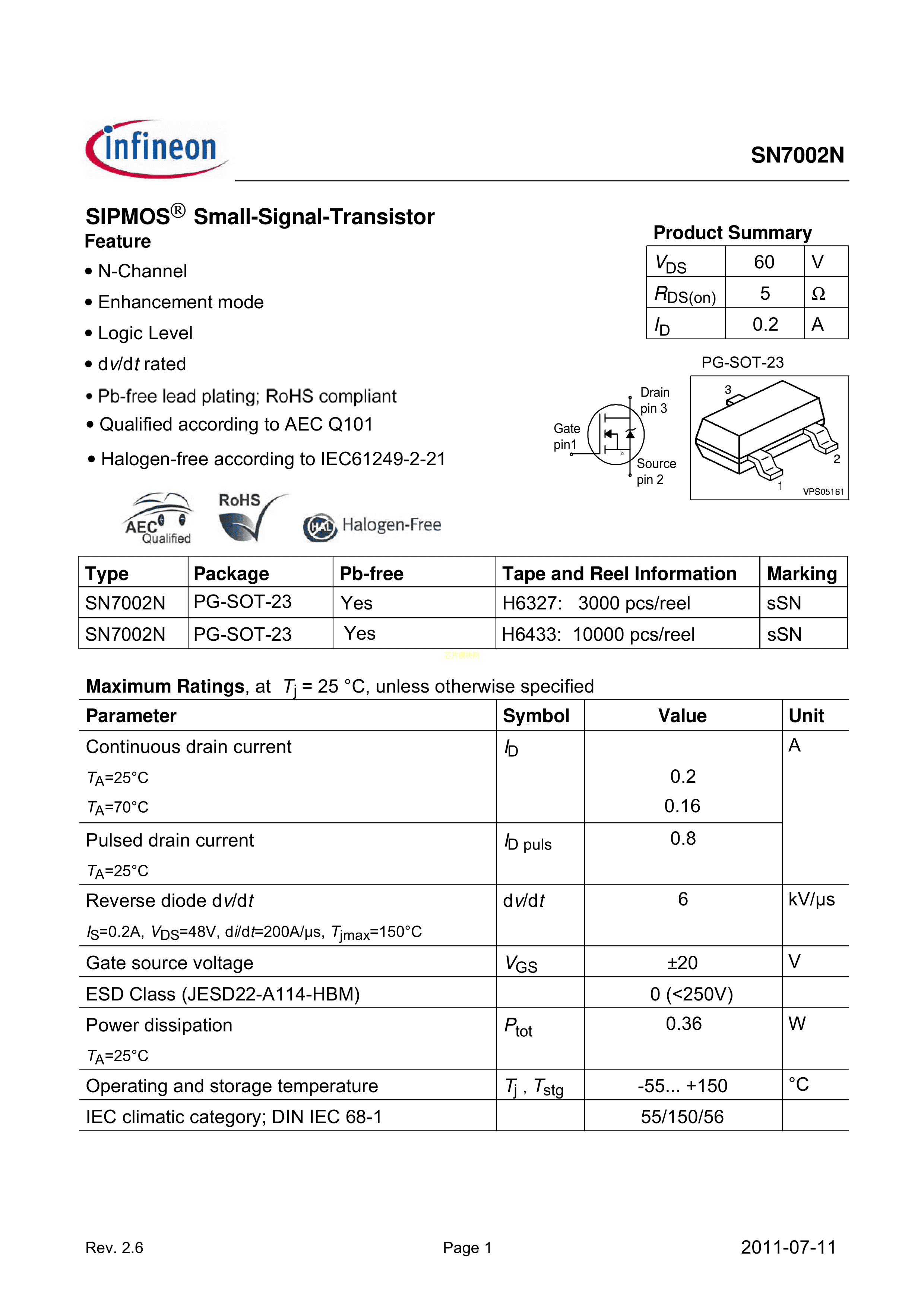 SN7002N H6433数据手册PG-SOT23封装Infineon(英飞凌)PDF规格书,中英文