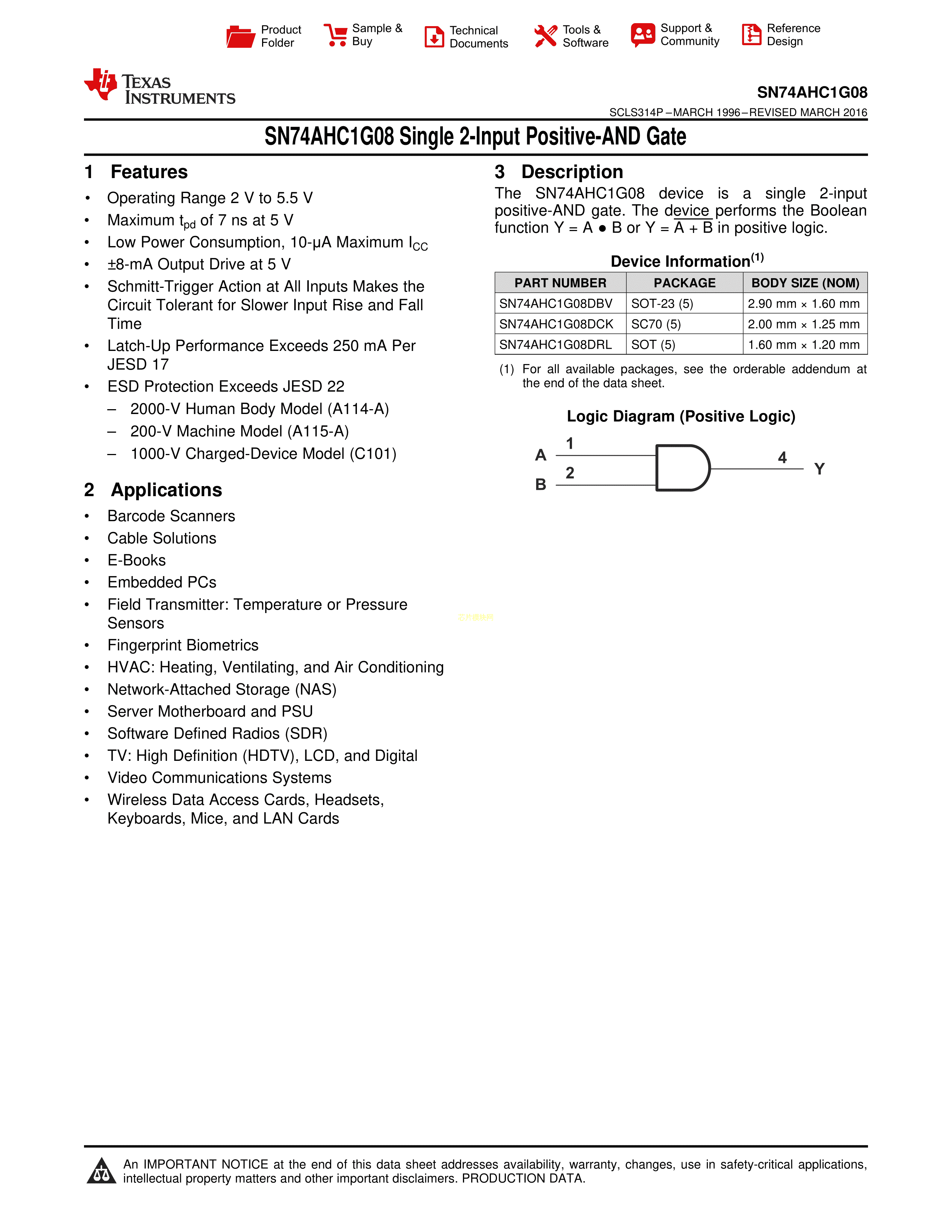 SN74AHC1G08DCKR数据手册SC-70-5封装TI(德州仪器)PDF规格书,中英文下载