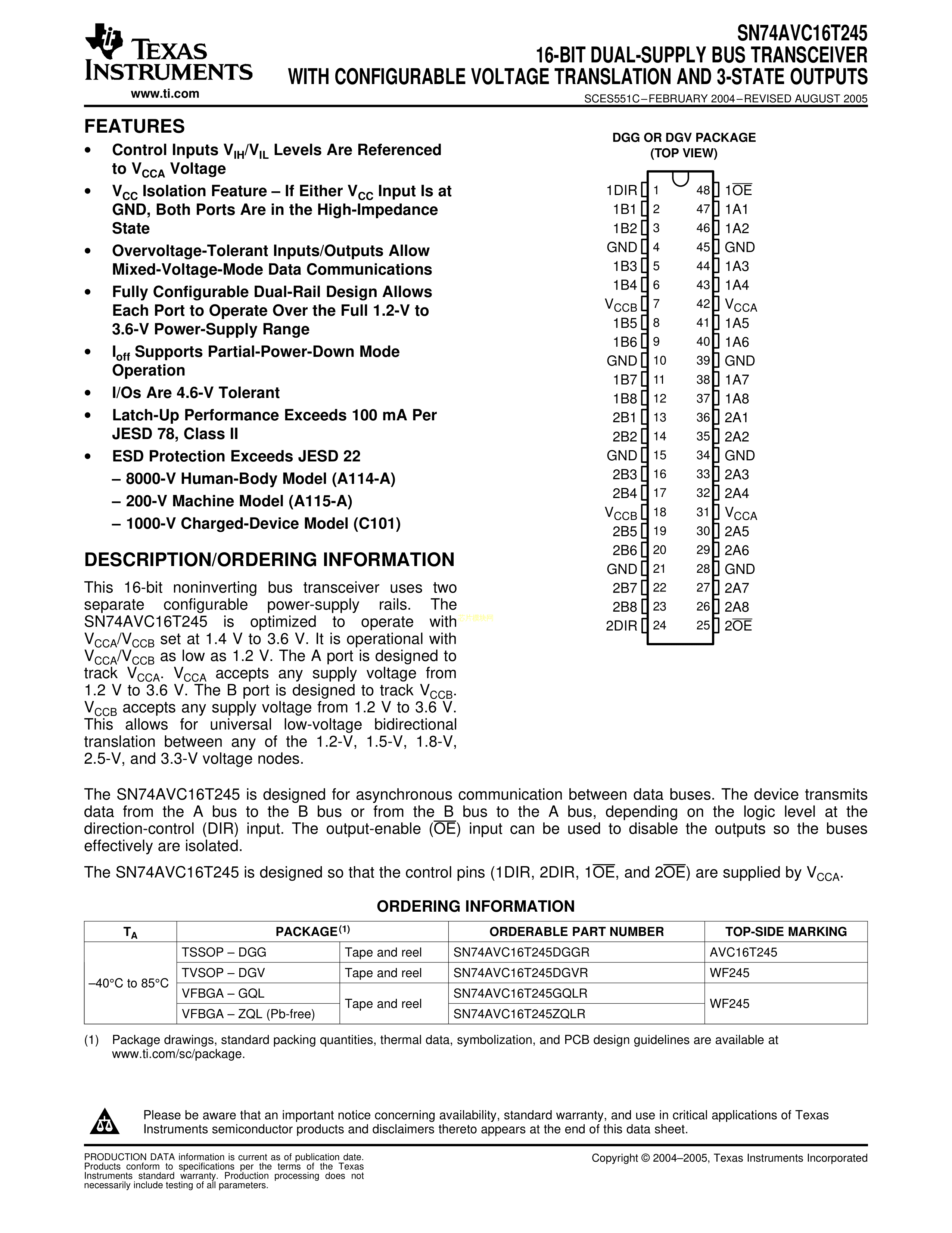 SN74AVC16T245DGVR数据手册TSSOP-48封装TI(德州仪器)PDF规格书,中英文下