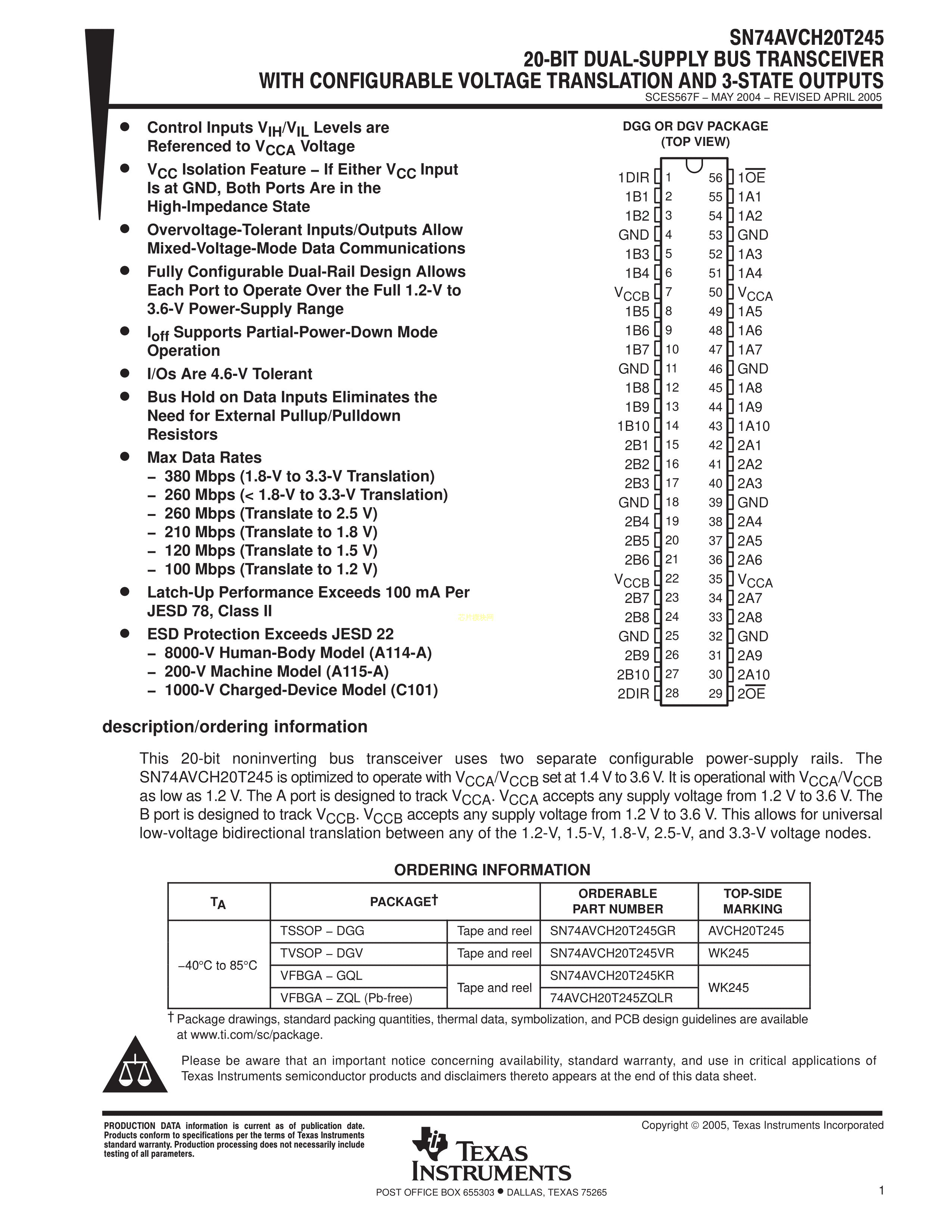 SN74AVCH20T245GR数据手册TSSOP-56封装TI(德州仪器)PDF规格书,中英文下载