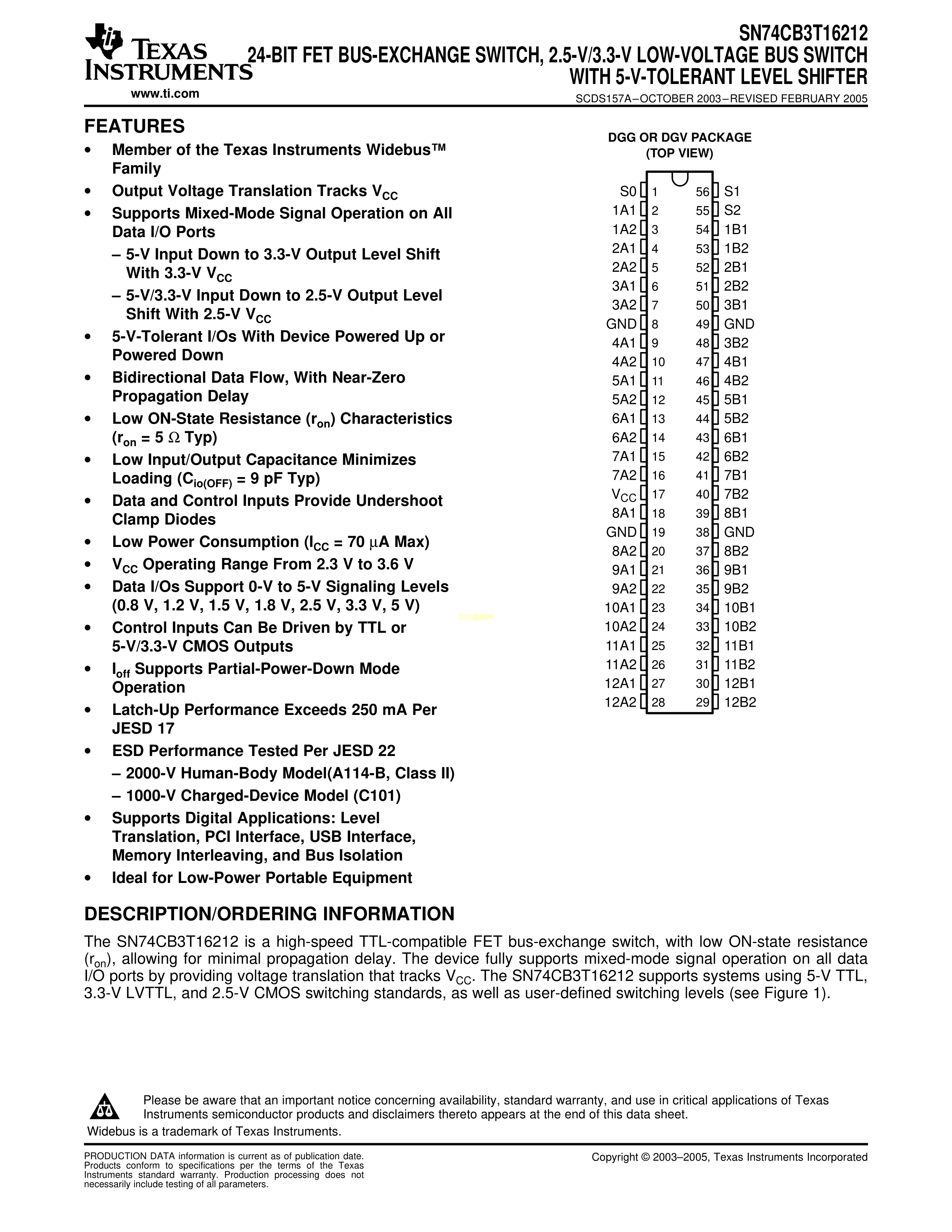 SN74CB3T16212DGGR数据手册TSSOP-56封装TI(德州仪器)PDF规格书,中英文下