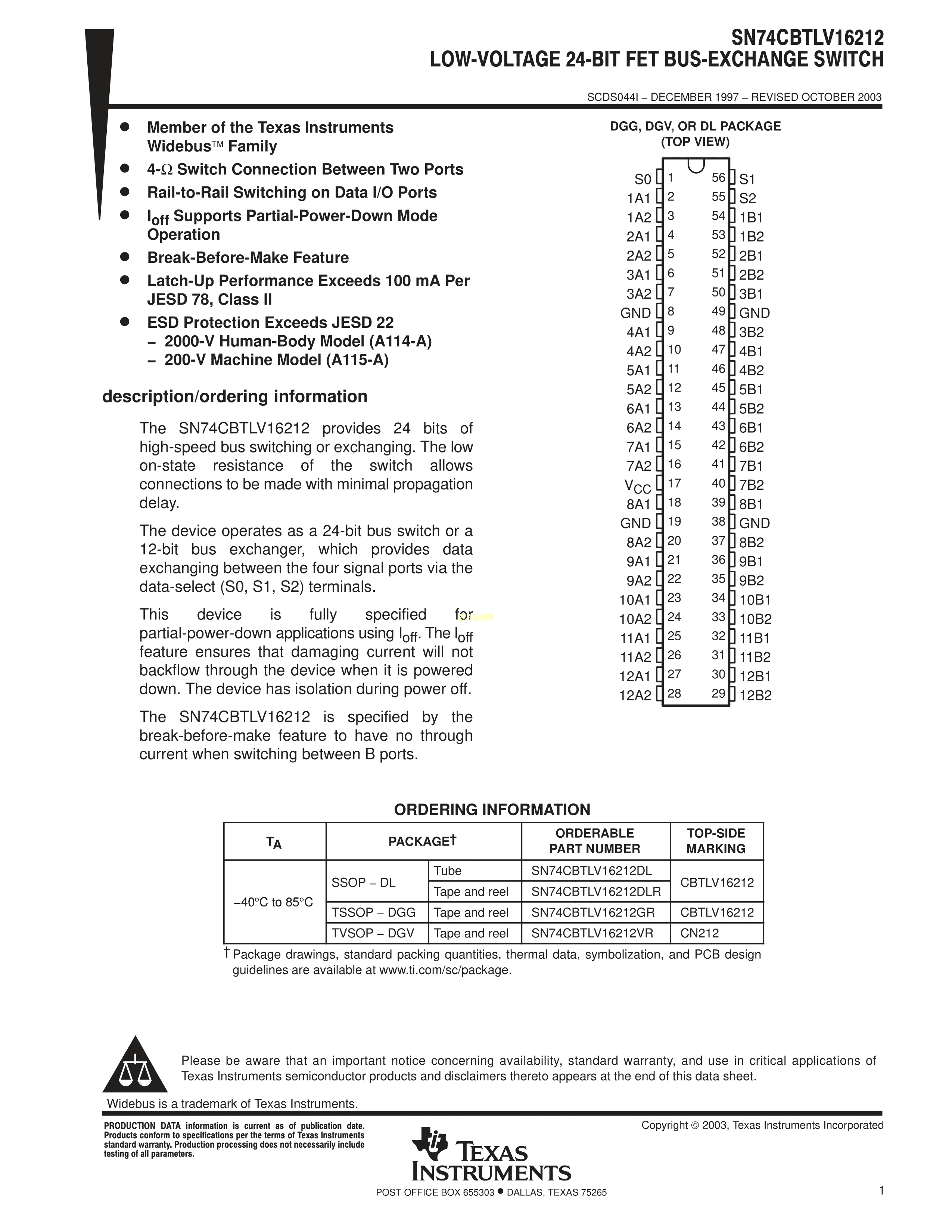 SN74CBTLV16212GR数据手册TSSOP-56封装TI(德州仪器)PDF规格书,中英文下载