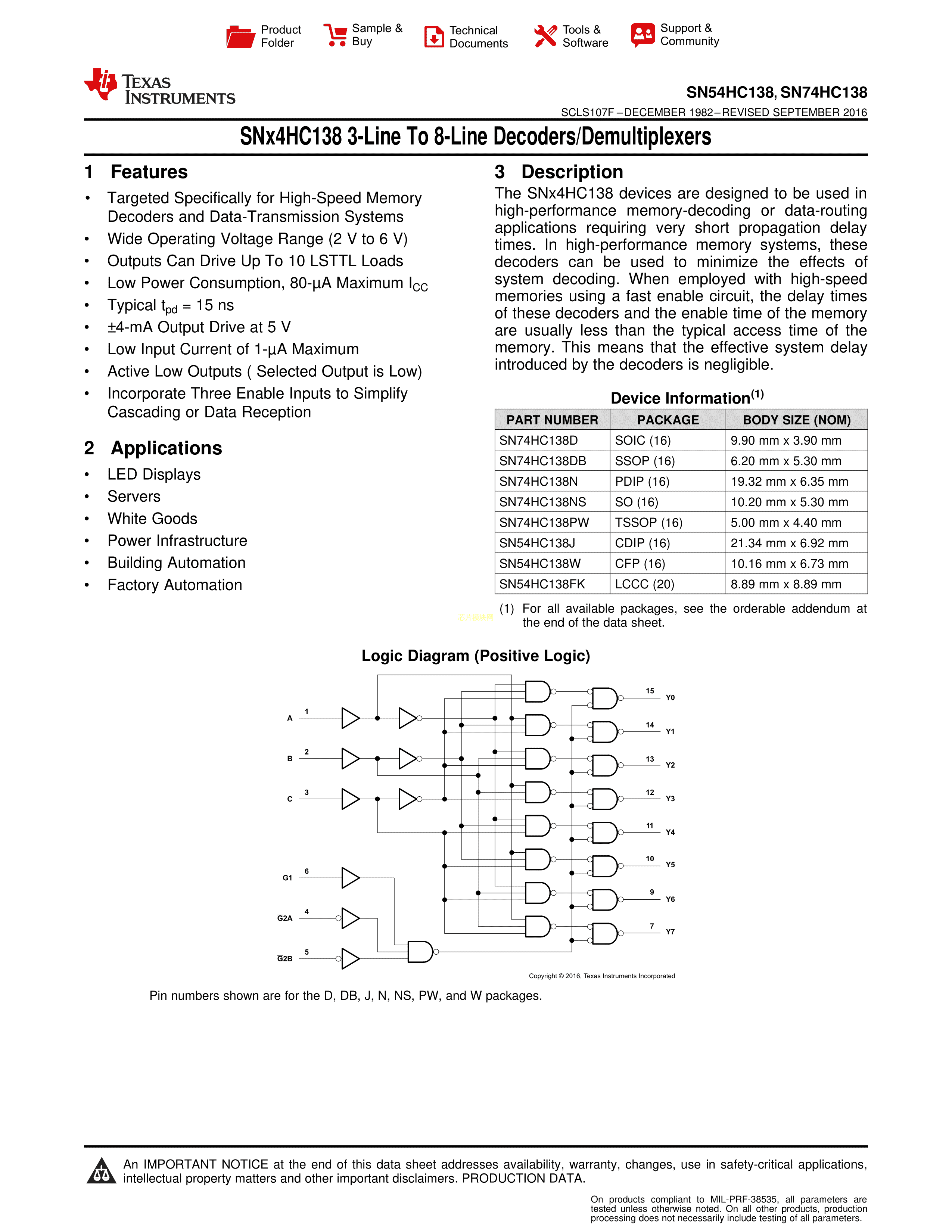 SN74HC138NSR数据手册SOP-16封装TI(德州仪器)PDF规格书,中英文下载