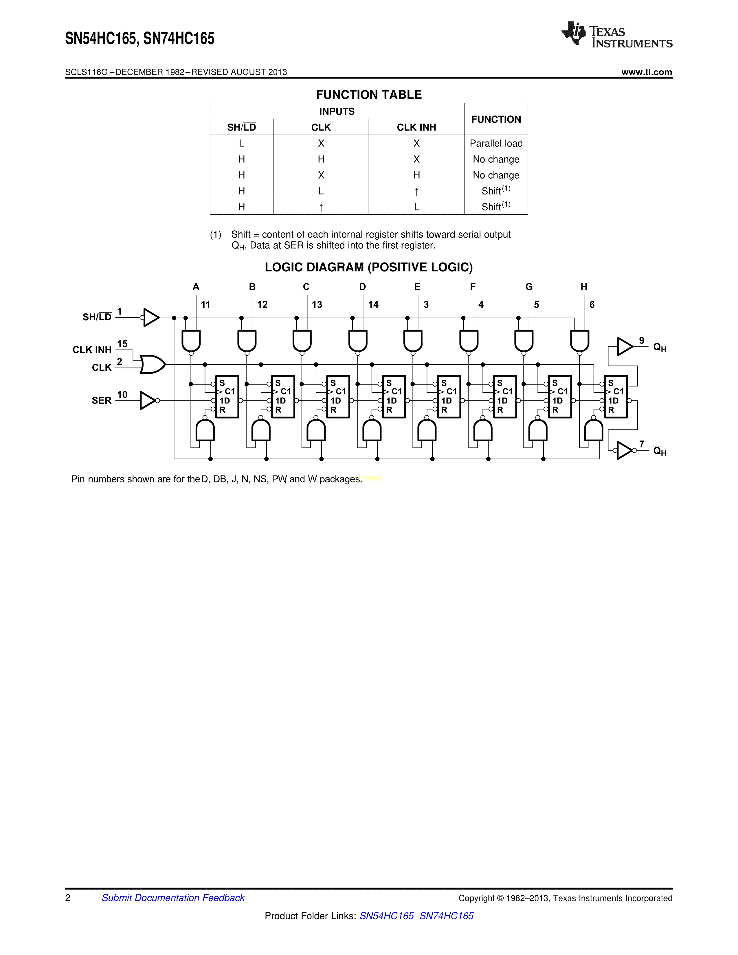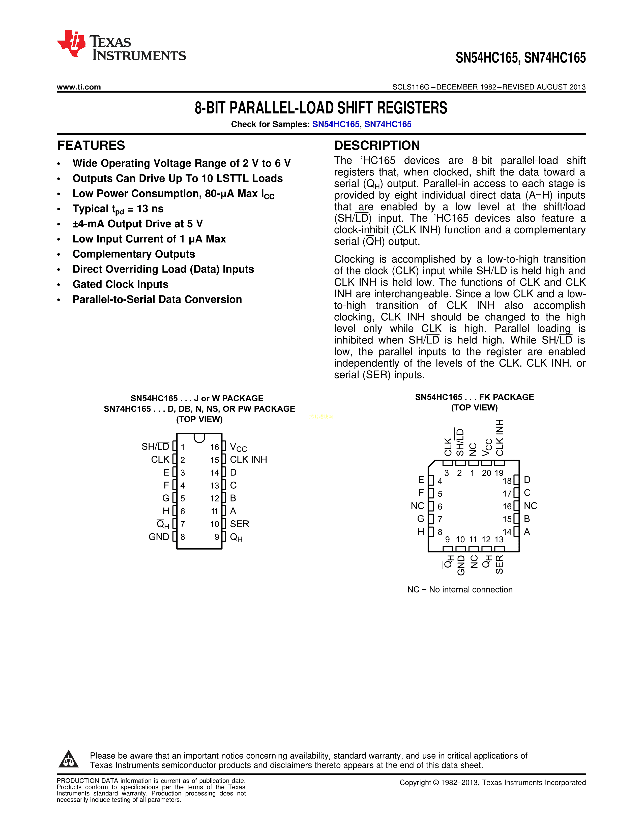 SN74HC165DR数据手册SOIC-16封装TI(德州仪器)PDF规格书,中英文下载