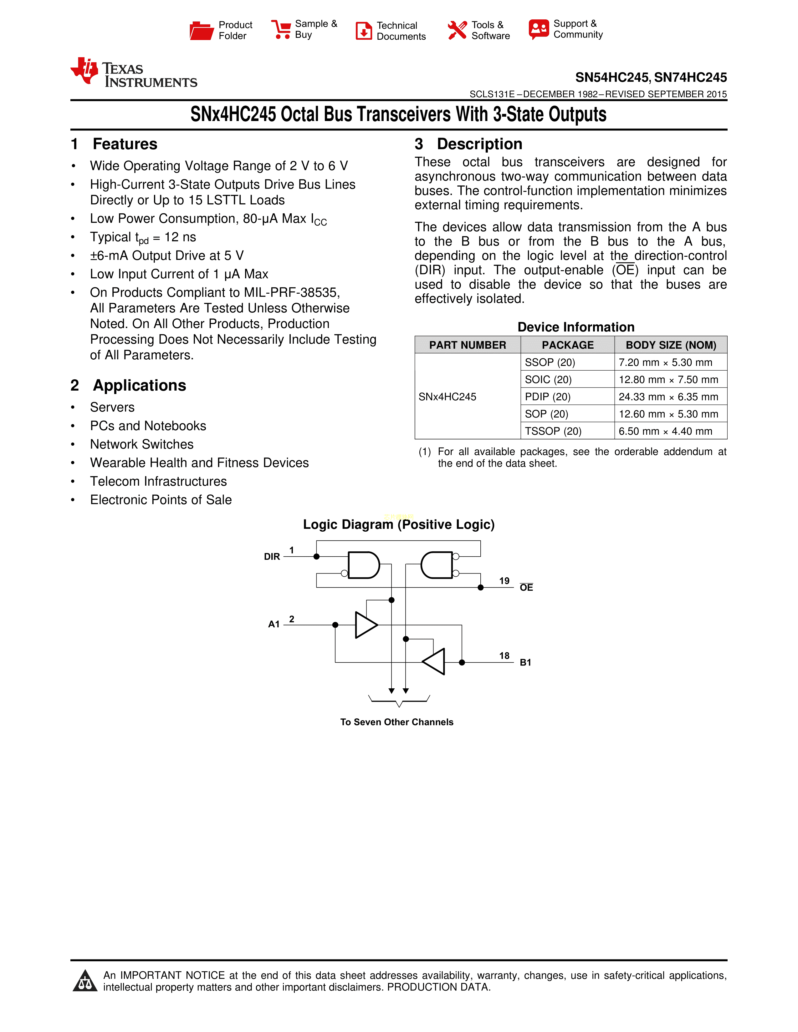 SN74HC245NSR数据手册SOP-20封装TI(德州仪器)PDF规格书,中英文下载