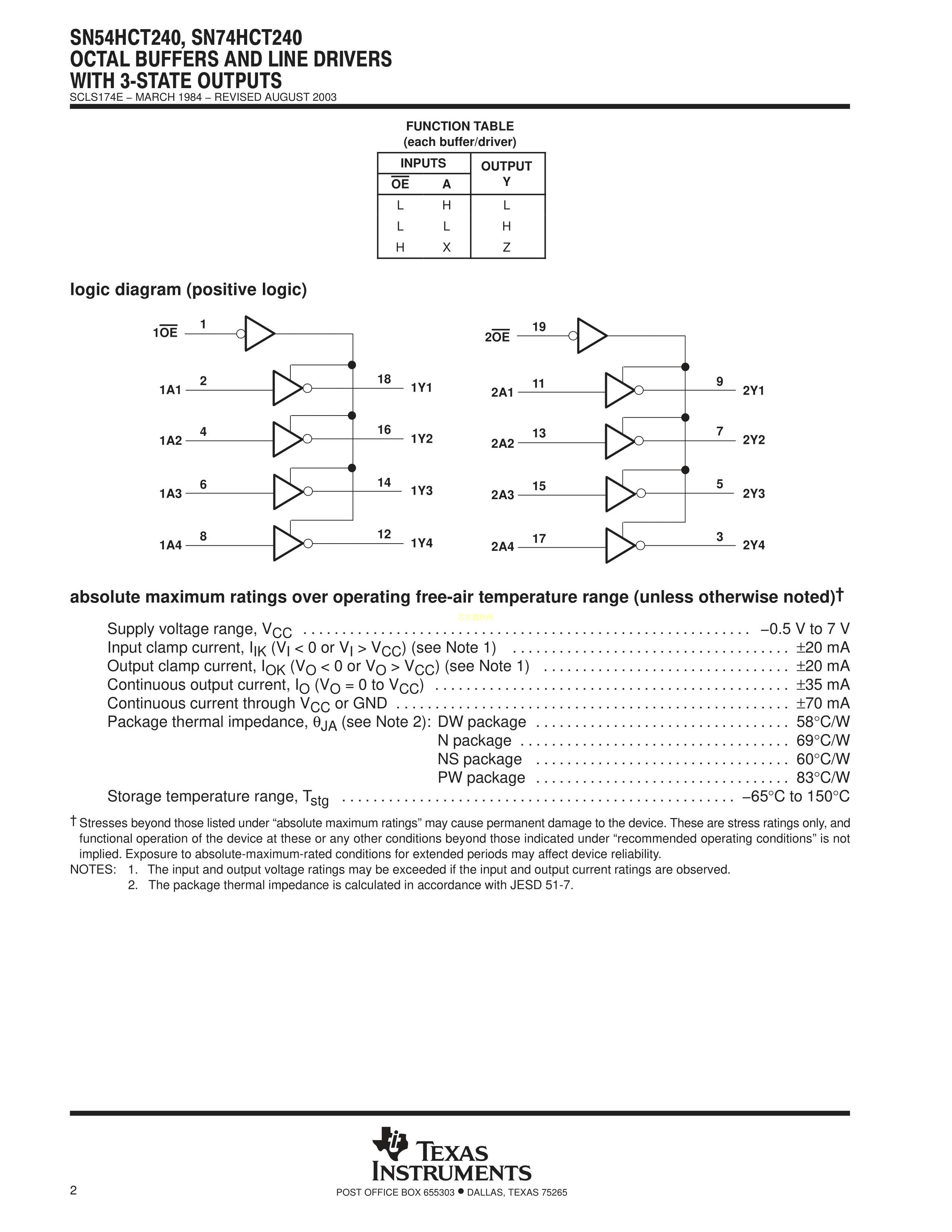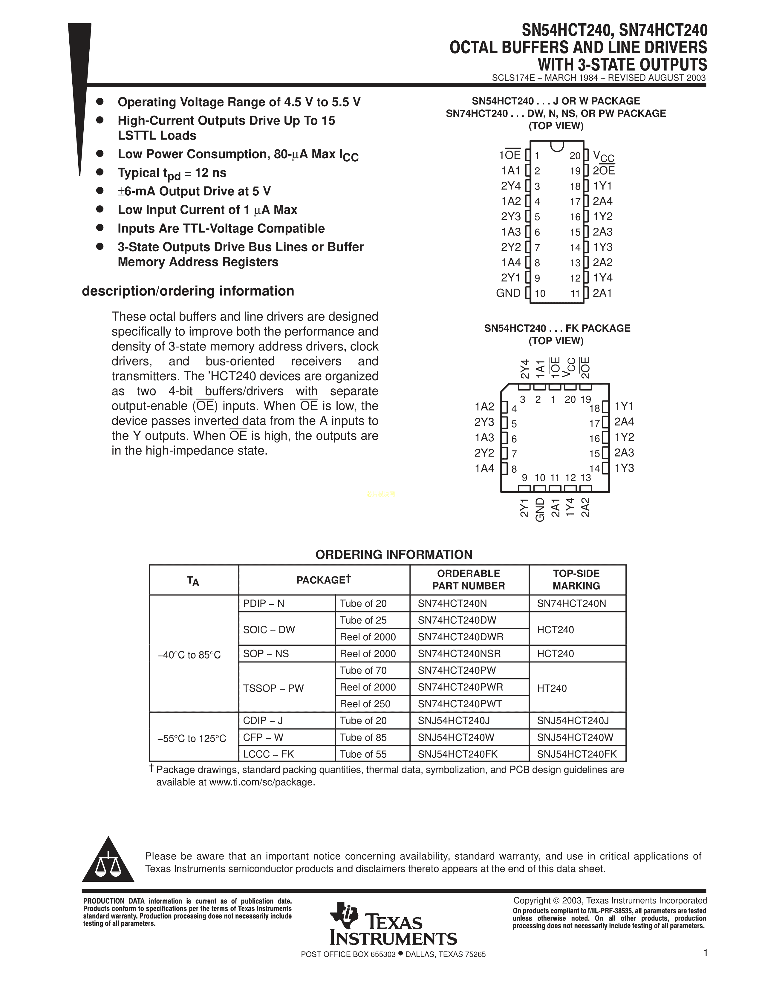 SN74HCT240DWR数据手册SOIC-20封装TI(德州仪器)PDF规格书,中英文下载