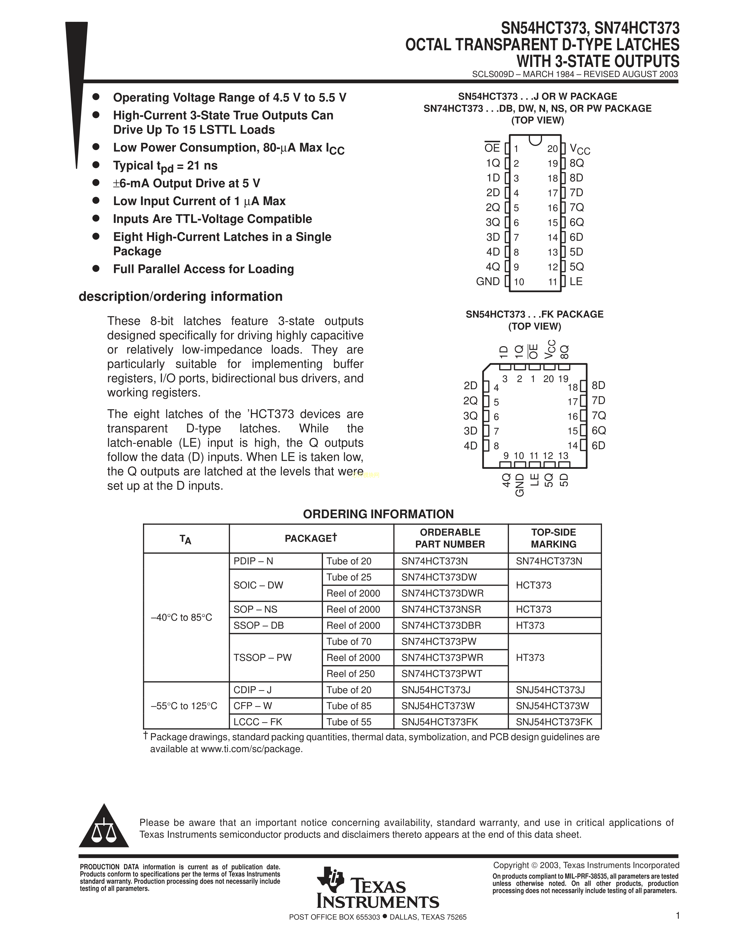 SN74HCT373N数据手册DIP-20封装TI(德州仪器)PDF规格书,中英文下载