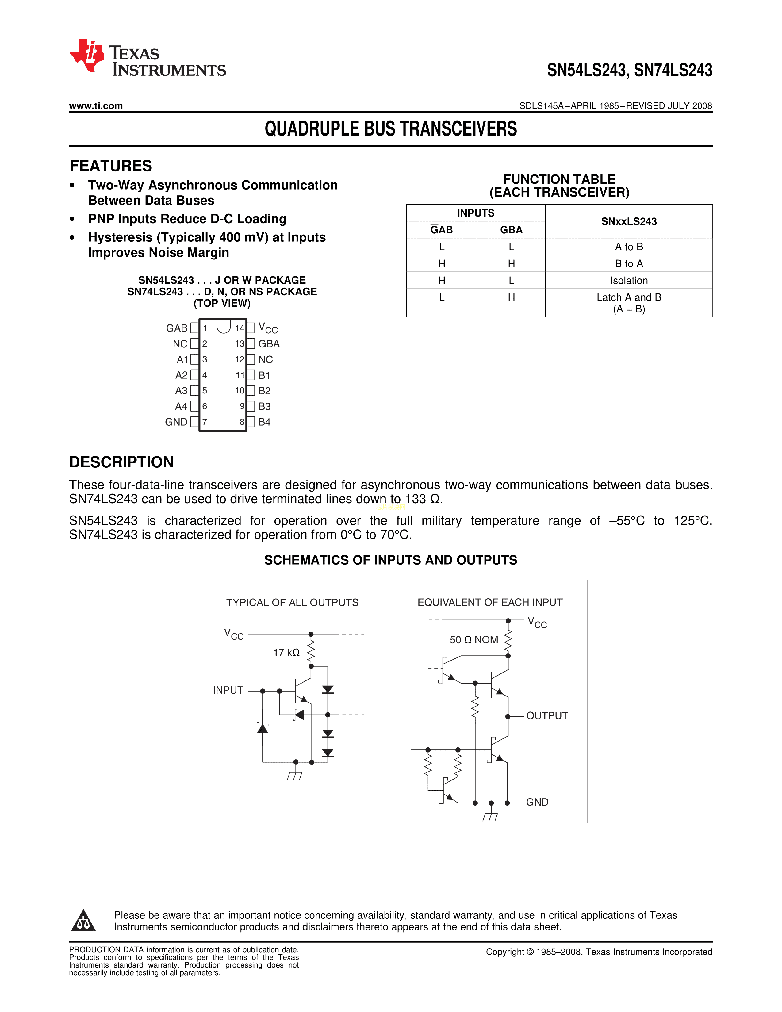 SN74LS243DR数据手册SOIC-14封装TI(德州仪器)PDF规格书,中英文下载