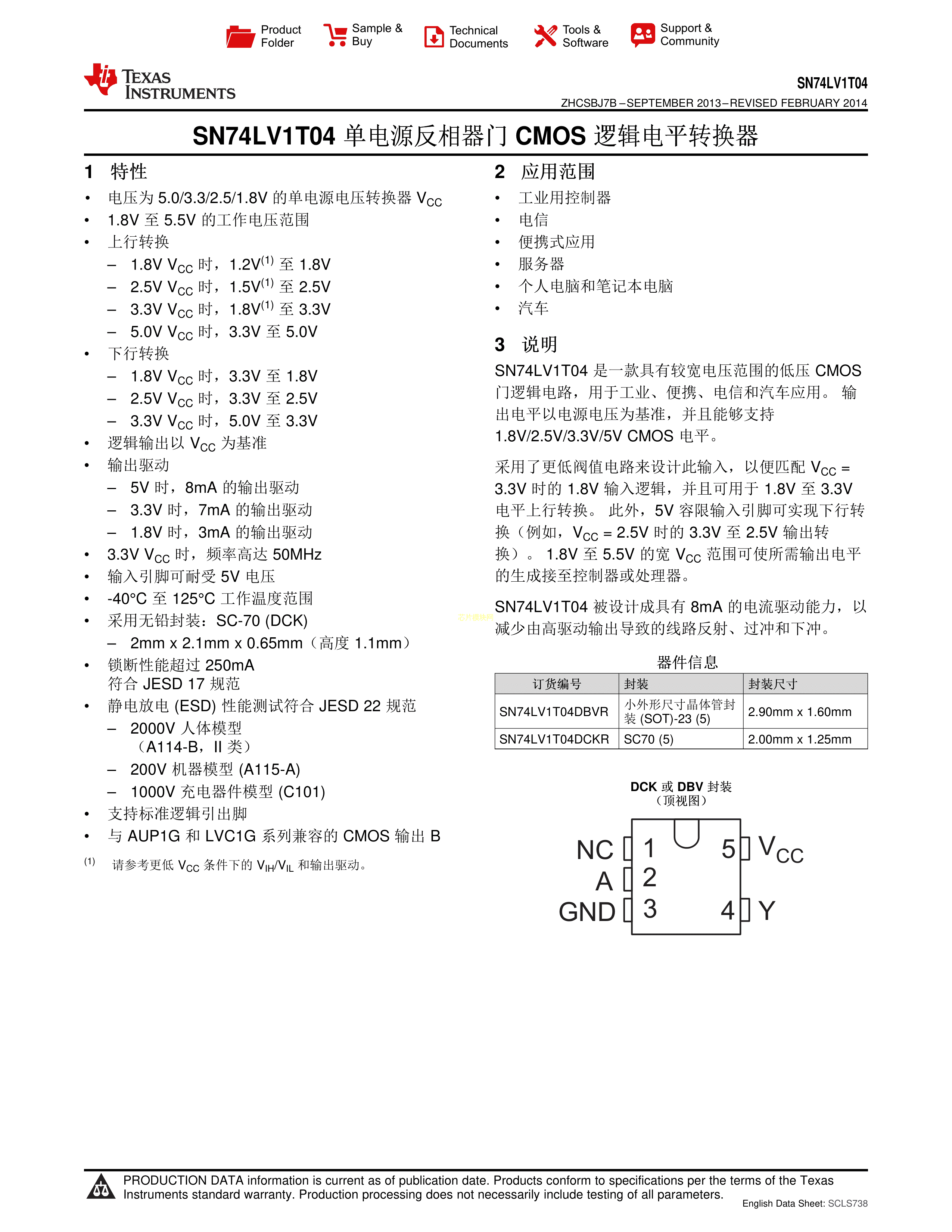 SN74LV1T04DCKR数据手册SC-70-5封装TI(德州仪器)PDF规格书,中英文下载