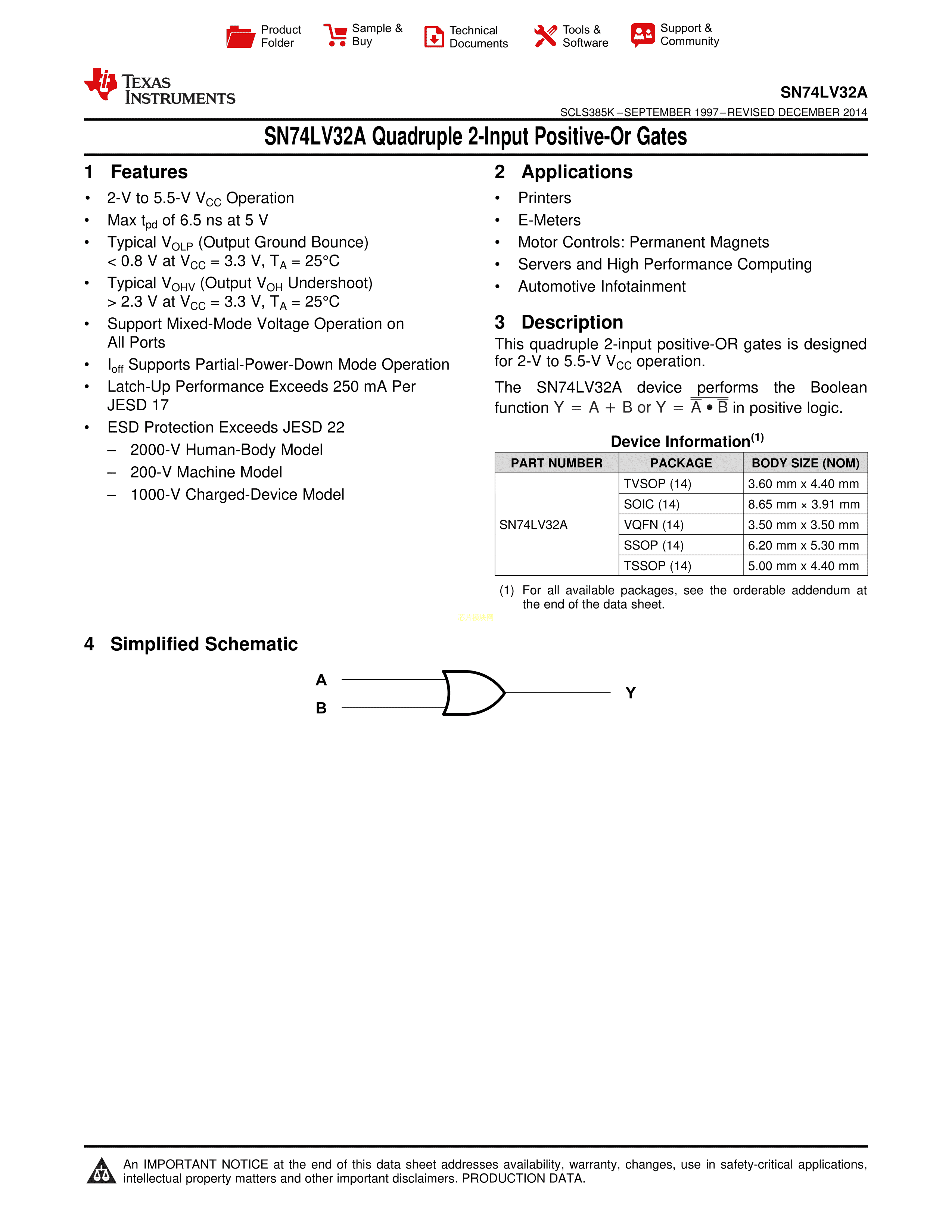 SN74LV32APWR数据手册TSSOP-14封装TI(德州仪器)PDF规格书,中英文下载