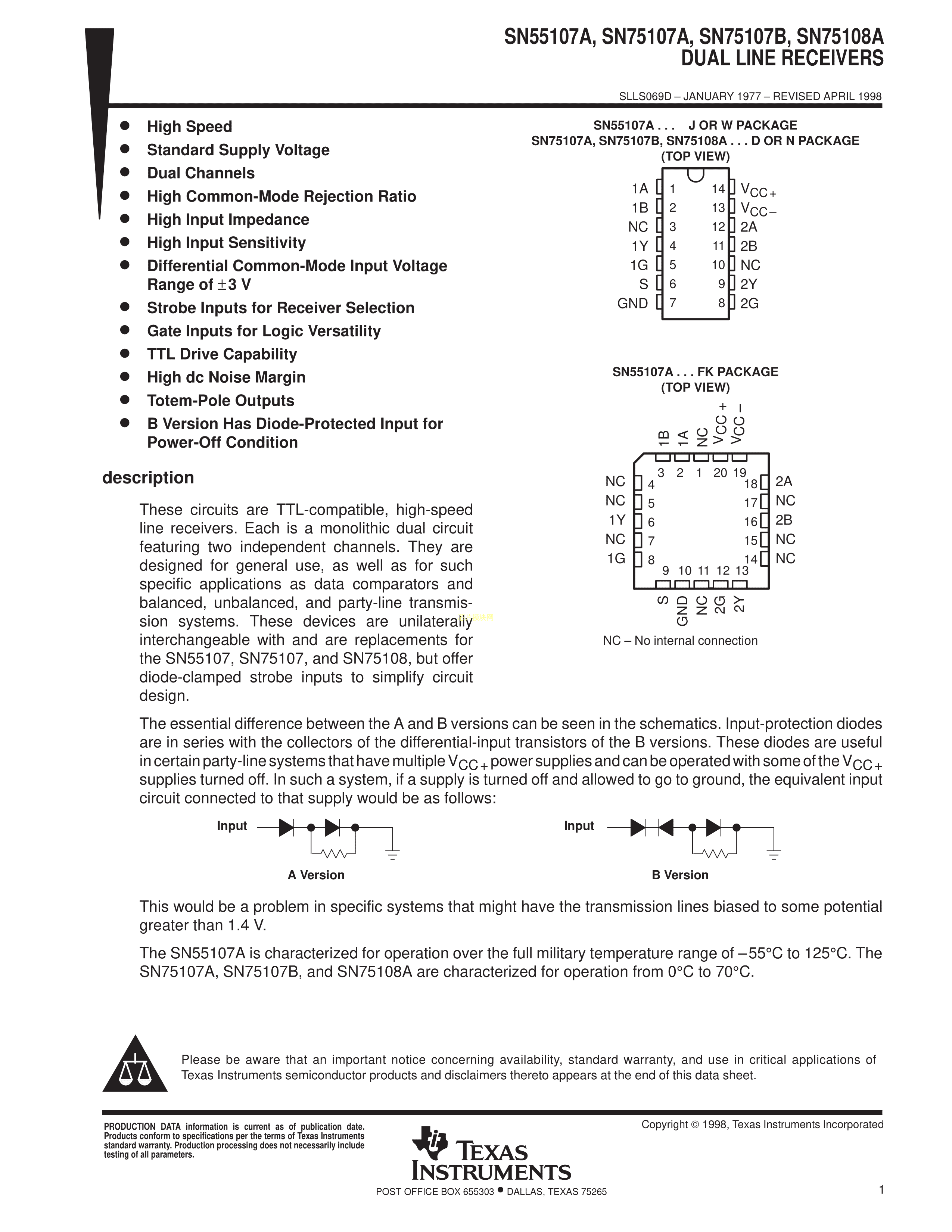 SN75107ADR数据手册SOIC-14_150mil封装TI(德州仪器)PDF规格书,中英文下载