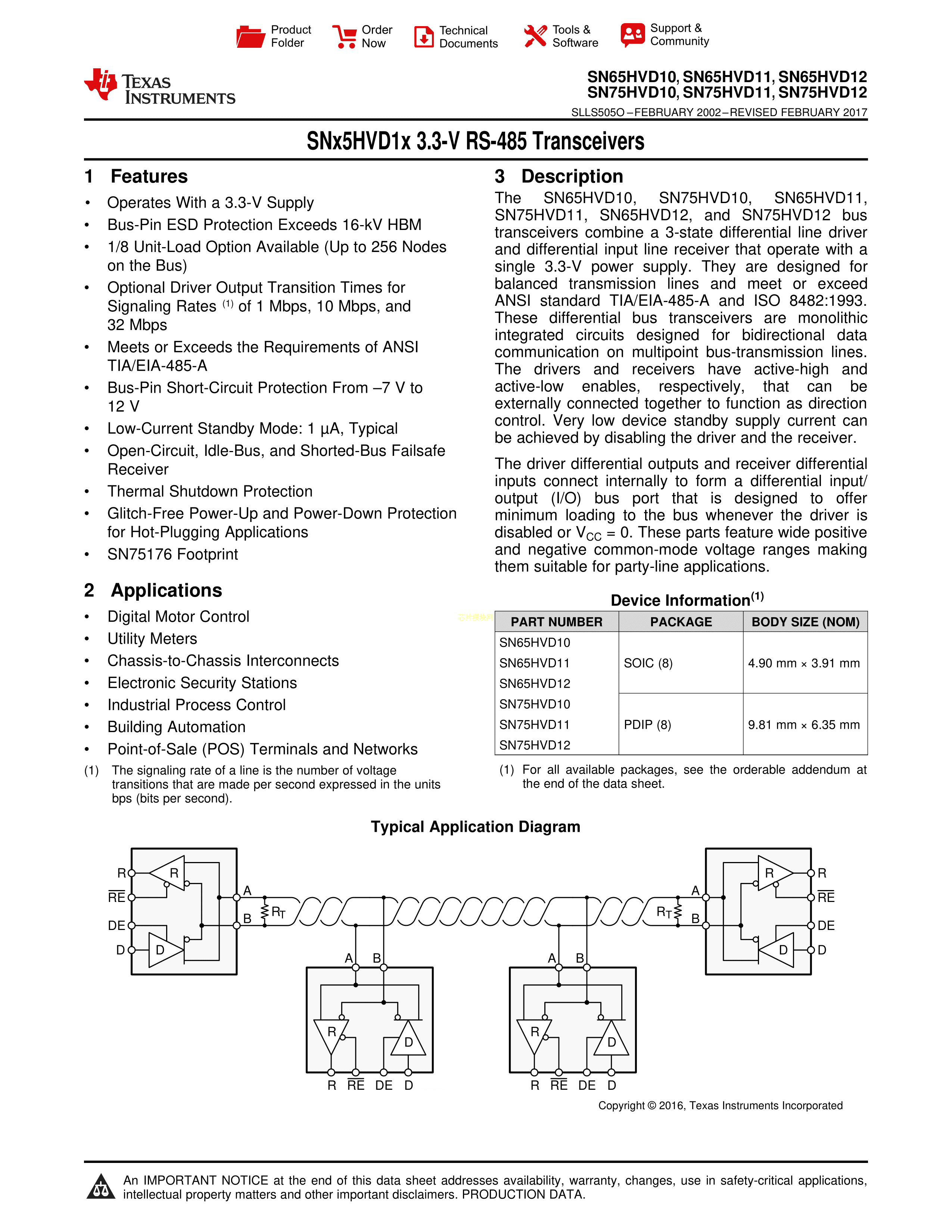 SN75HVD12DR数据手册SOIC-8封装TI(德州仪器)PDF规格书,中英文下载