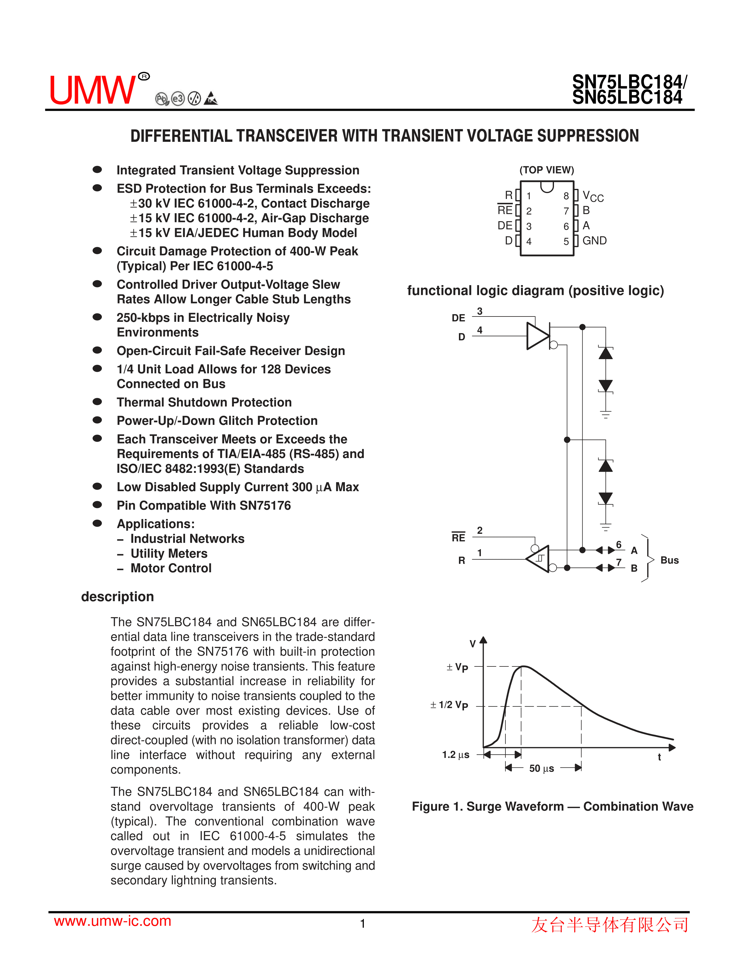 SN75LBC184DR数据手册SOP-8封装UMW(友台半导体)PDF规格书,中英文下载