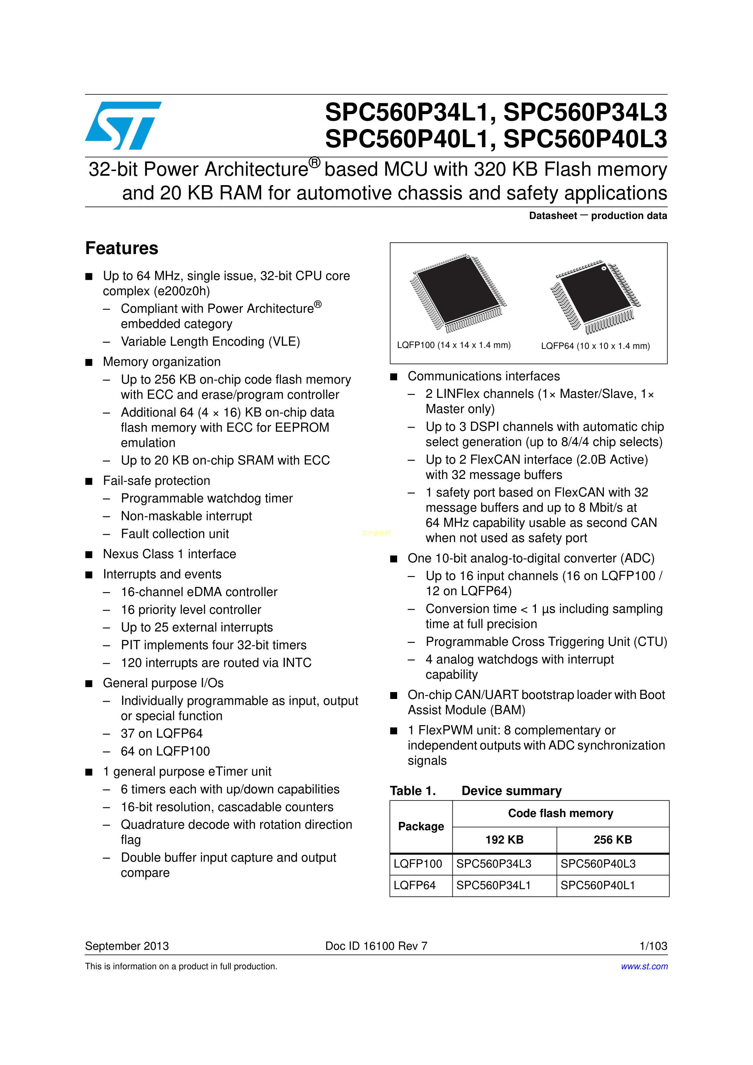 SPC560P34L1CEFAY数据手册LQFP-64(10x10)封装ST(意法半导体)PDF规格