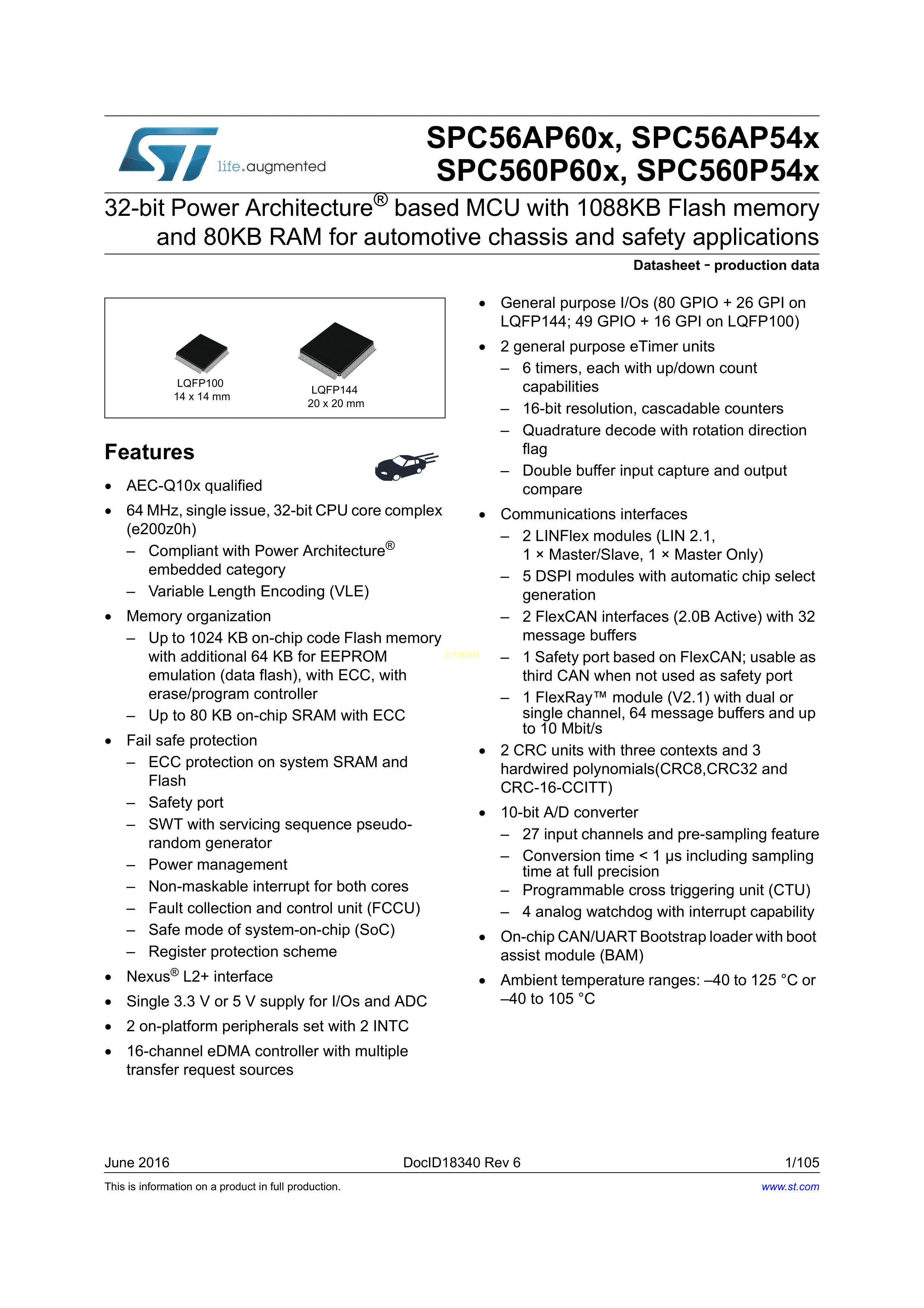 SPC560P54L5CEFAR数据手册LQFP-144(20x20)封装ST(意法半导体)PDF规