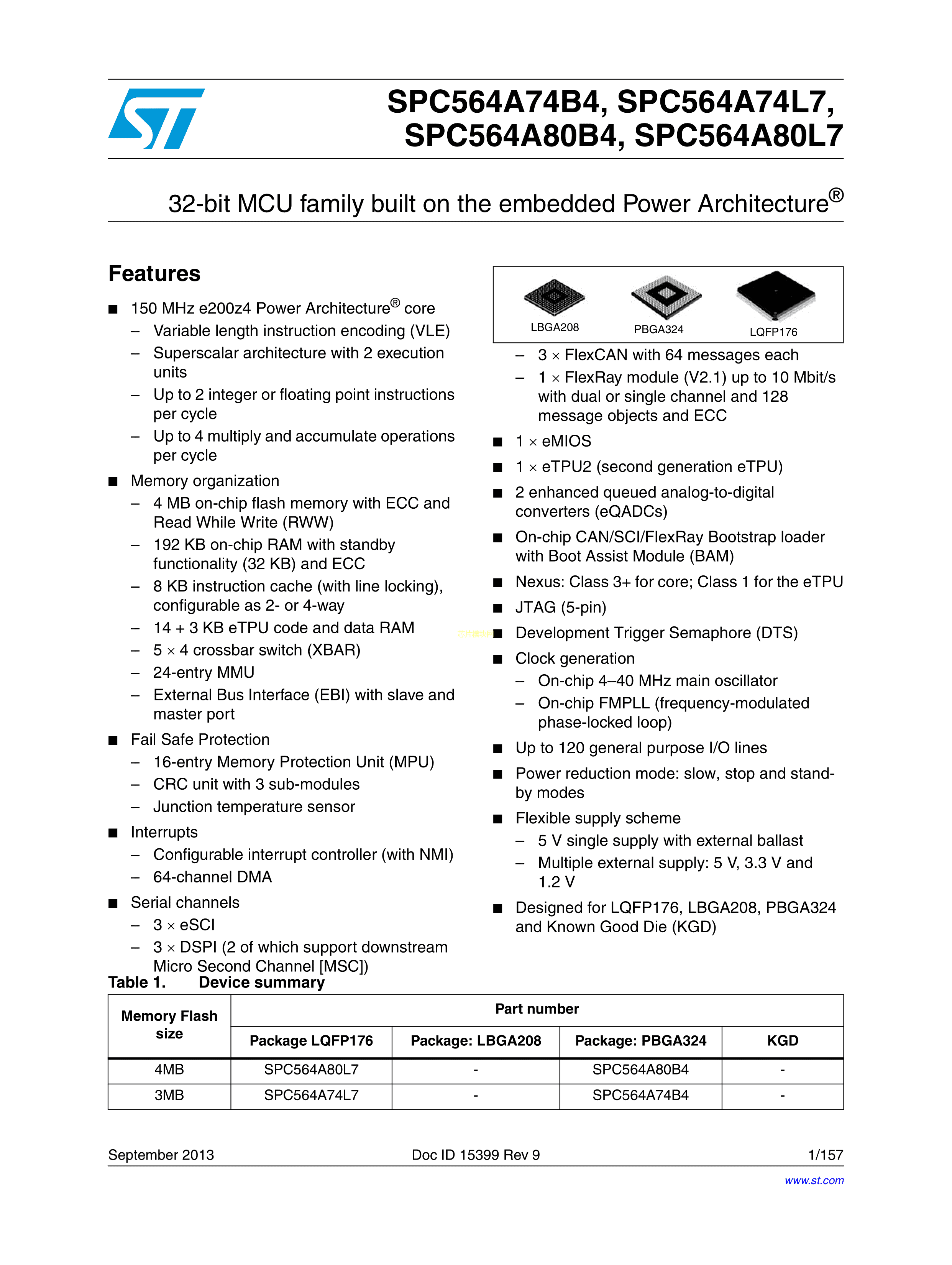 SPC564A80L7CFBY数据手册LQFP-176(24x24)封装ST(意法半导体)PDF规格