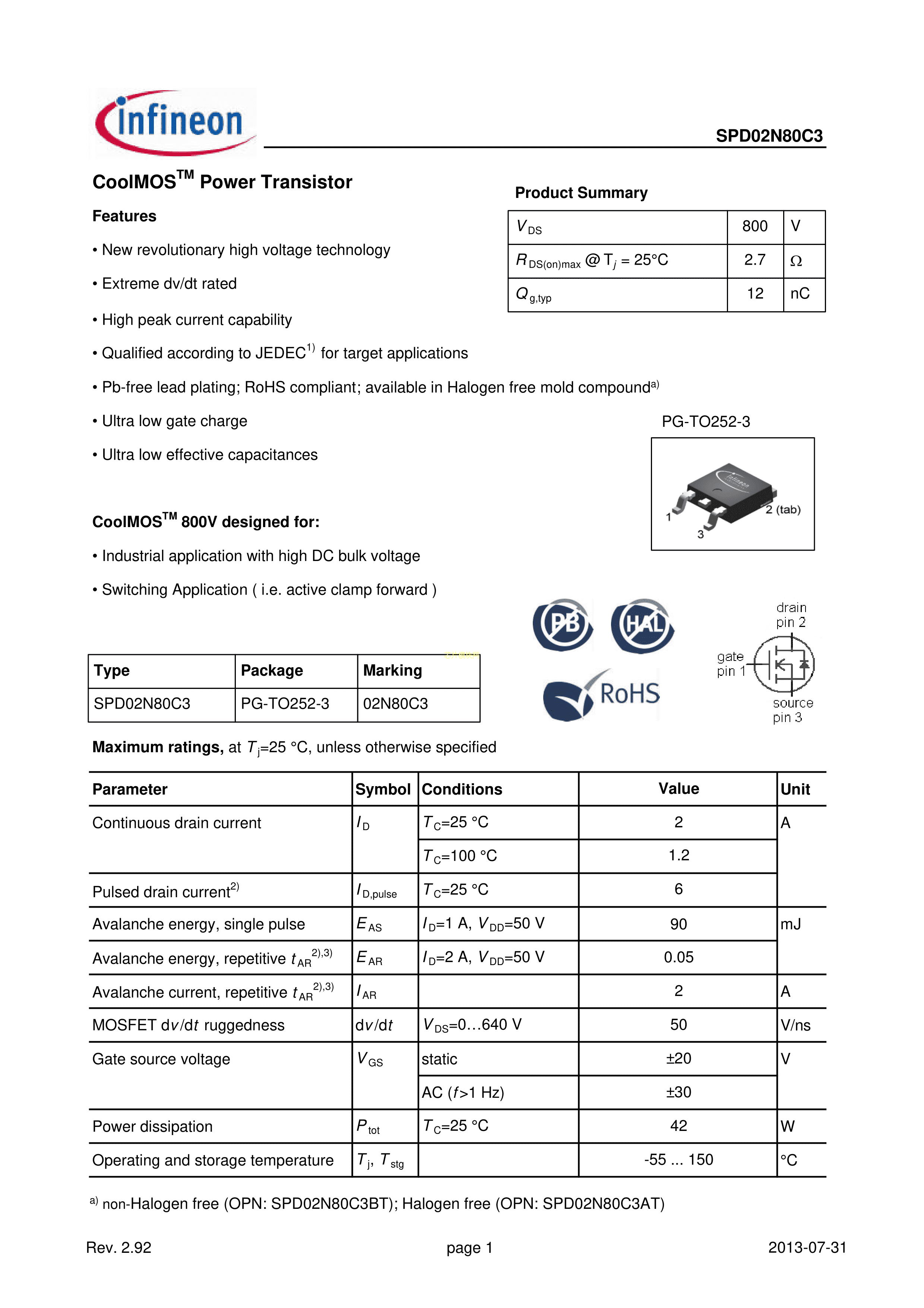 SPD02N80C3数据手册TO-252-2(DPAK)封装Infineon(英飞凌)PDF规格书,