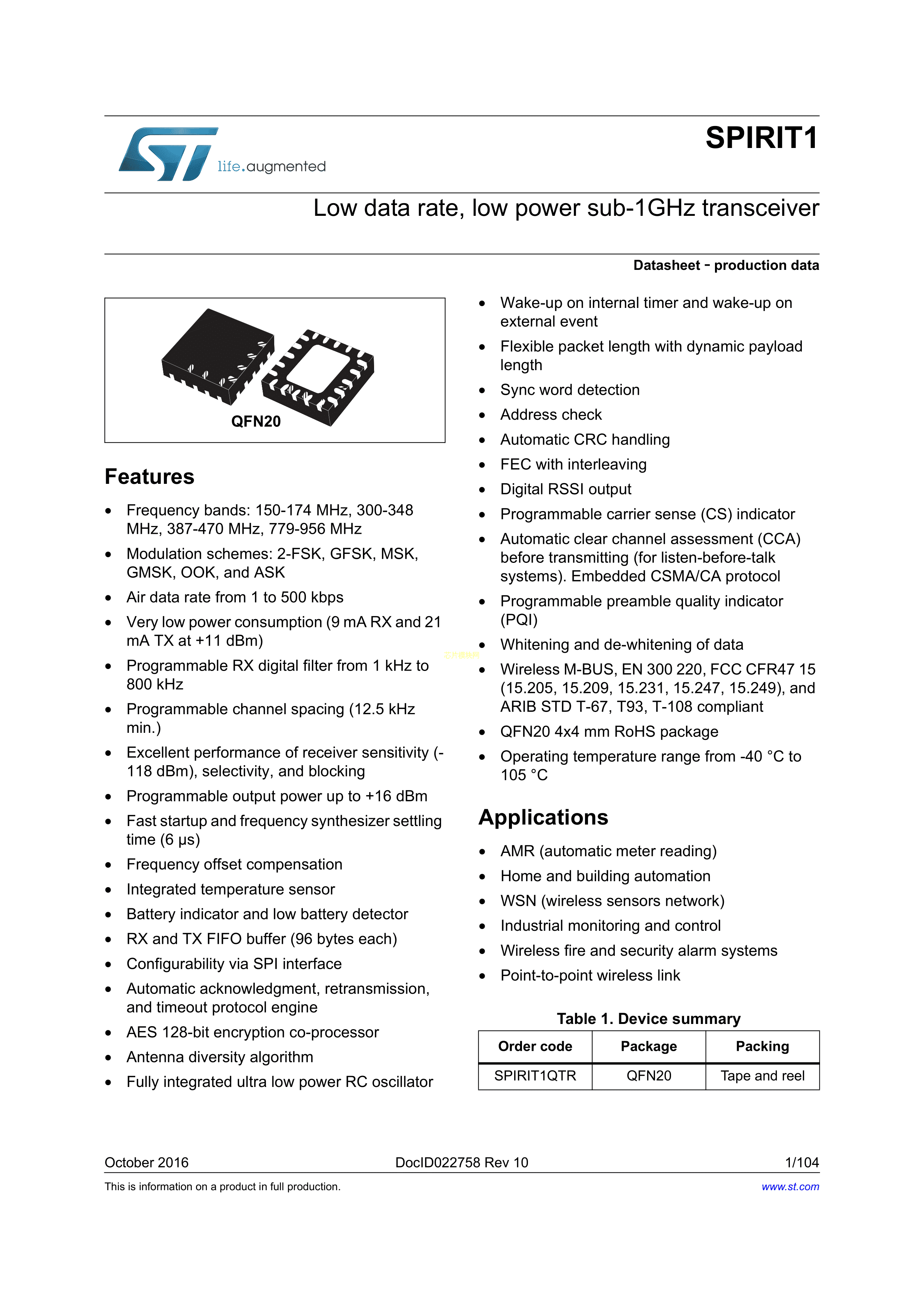 SPIRIT1QTR数据手册QFN-20(4x4)封装ST(意法半导体)PDF规格书,中英文下载
