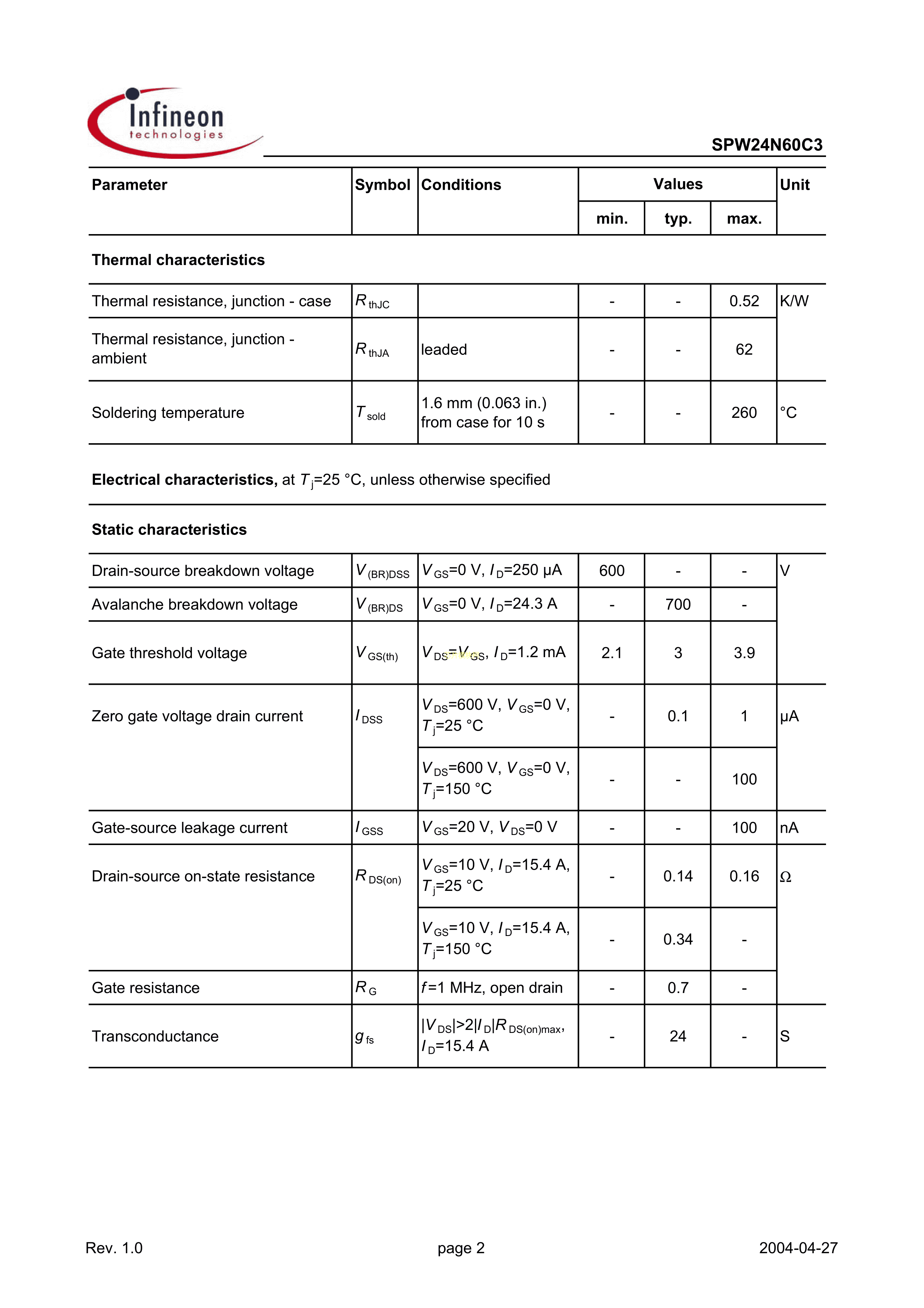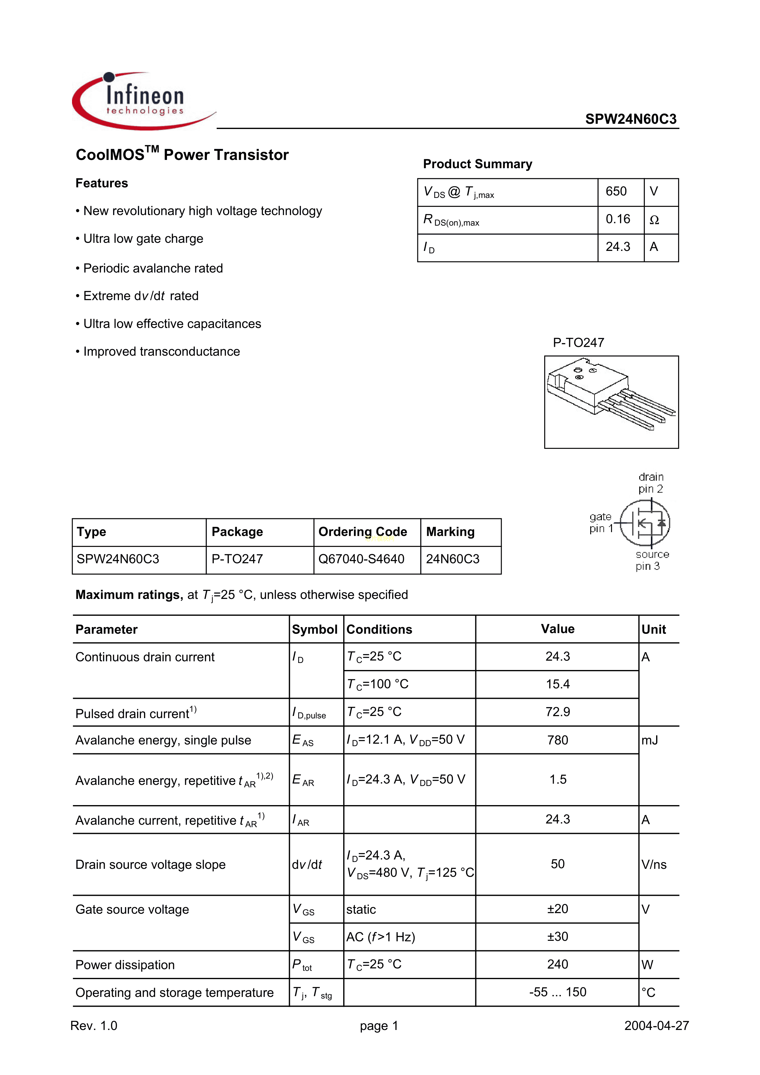 SPW24N60C3数据手册TO-247AC封装Infineon(英飞凌)PDF规格书,中英文下载
