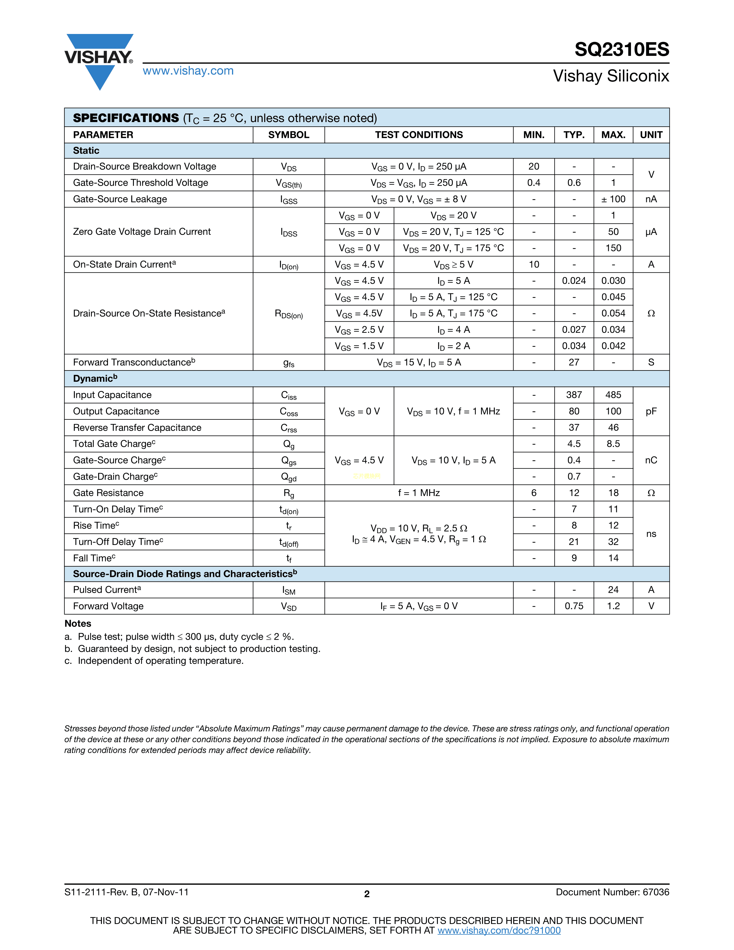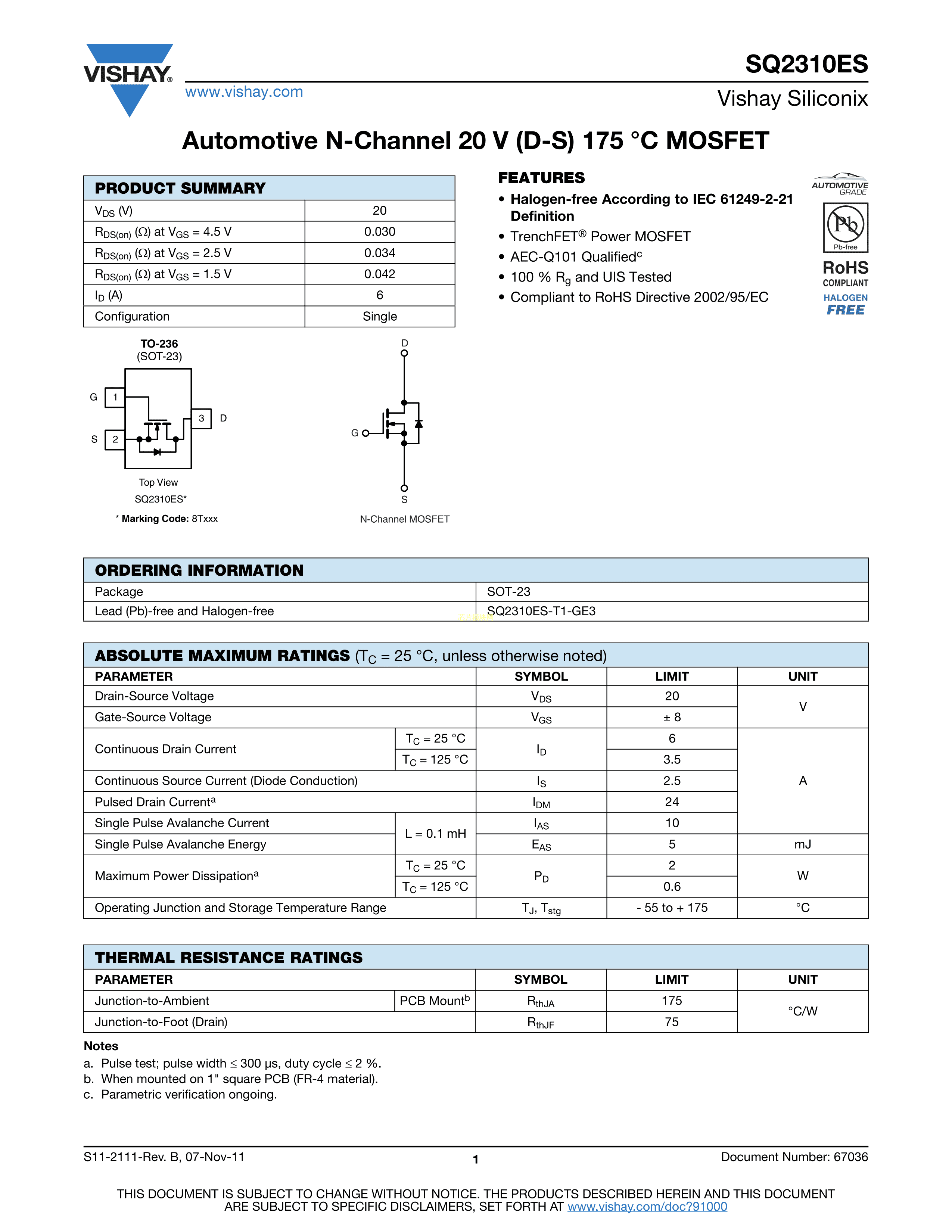 SQ2310ES-T1_GE3数据手册SOT-23(SOT-23-3)封装VISHAY(威世)PDF