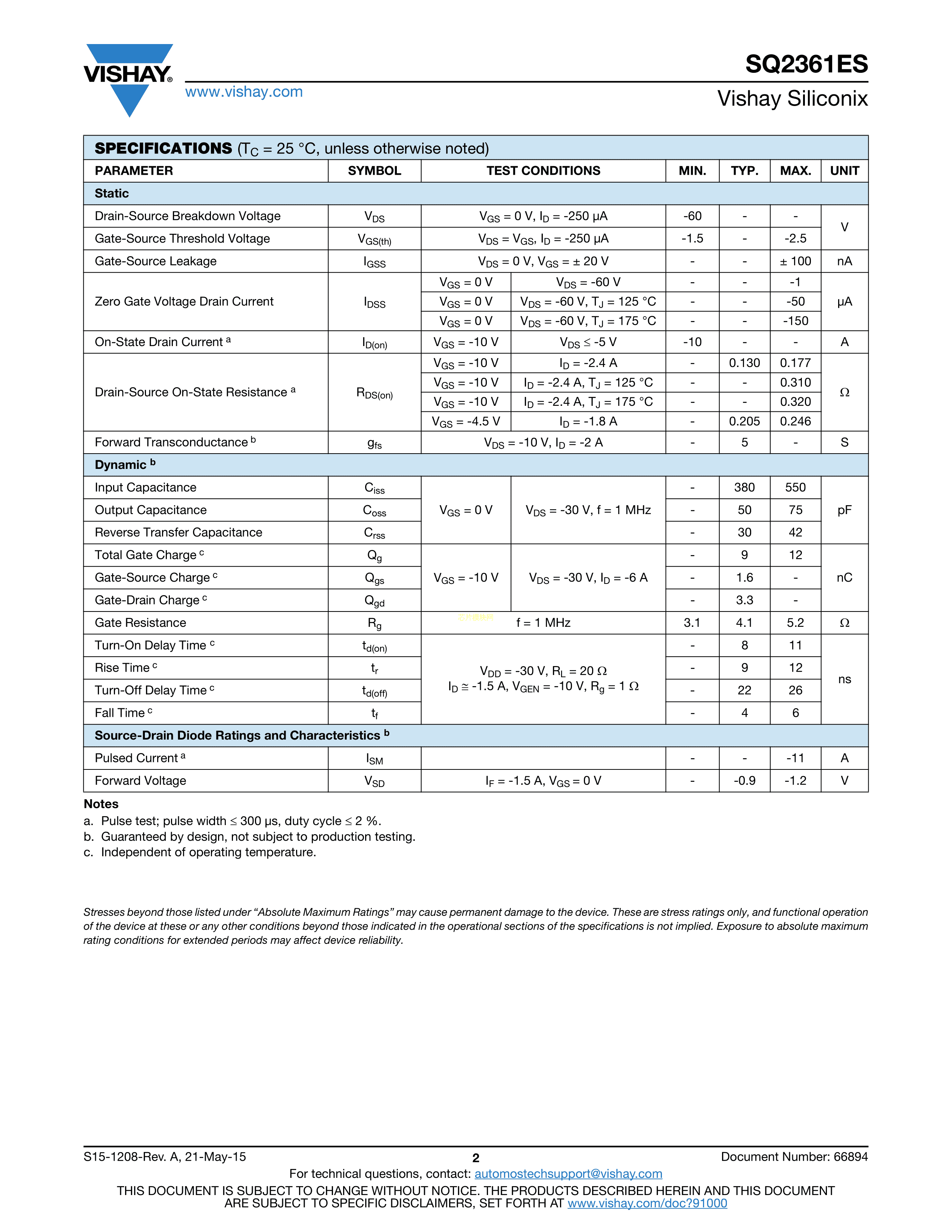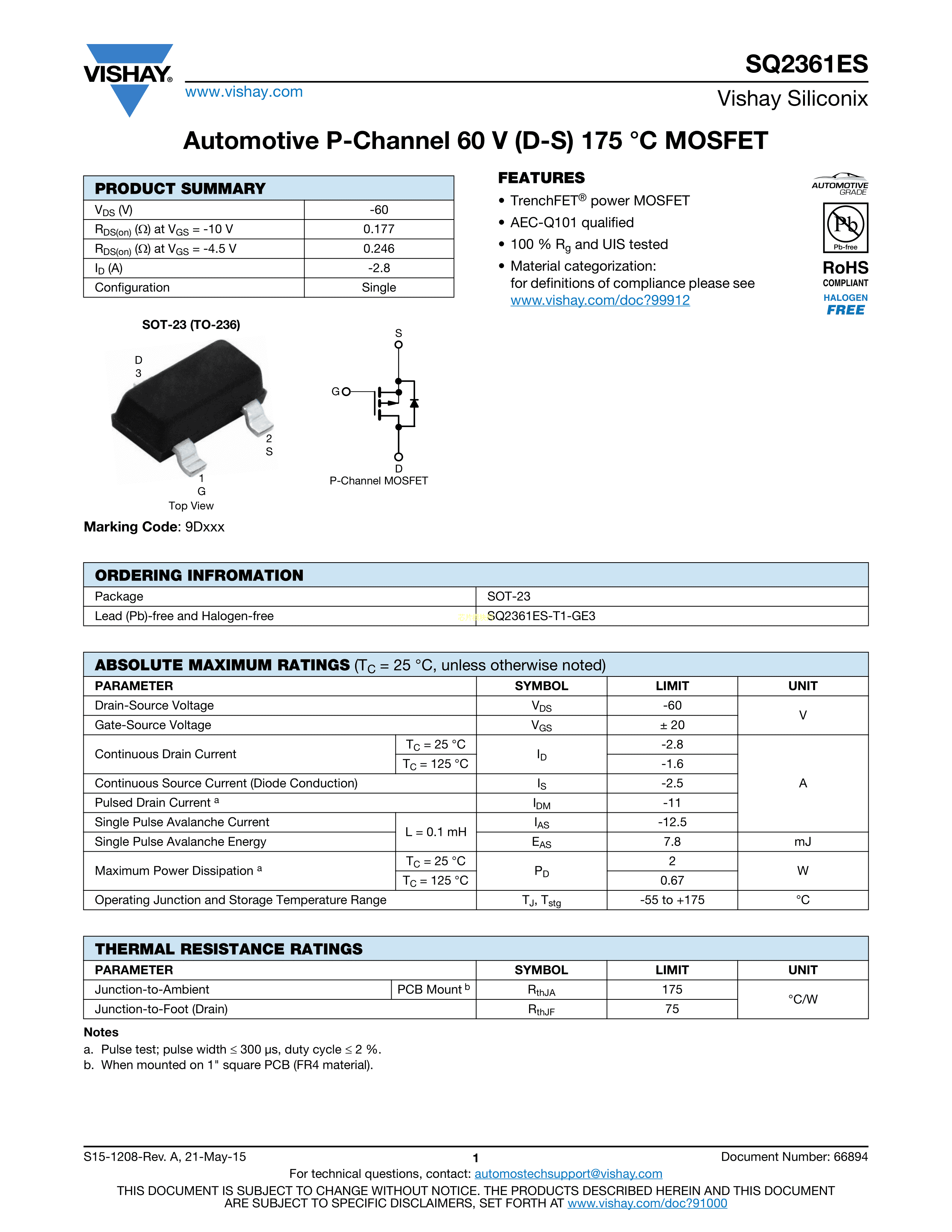 SQ2361ES-T1_GE3数据手册SOT-23-3封装VISHAY(威世)PDF规格书,中英文下