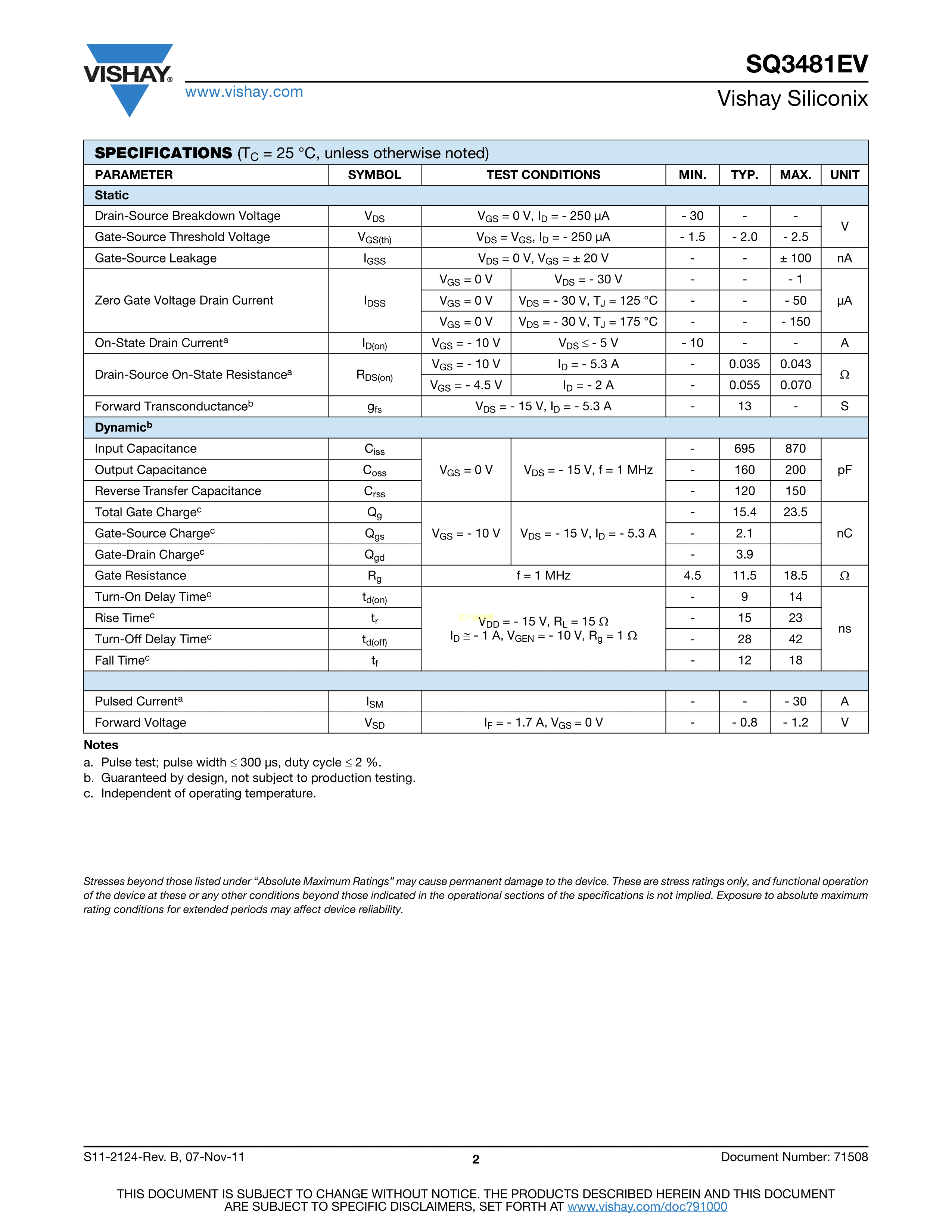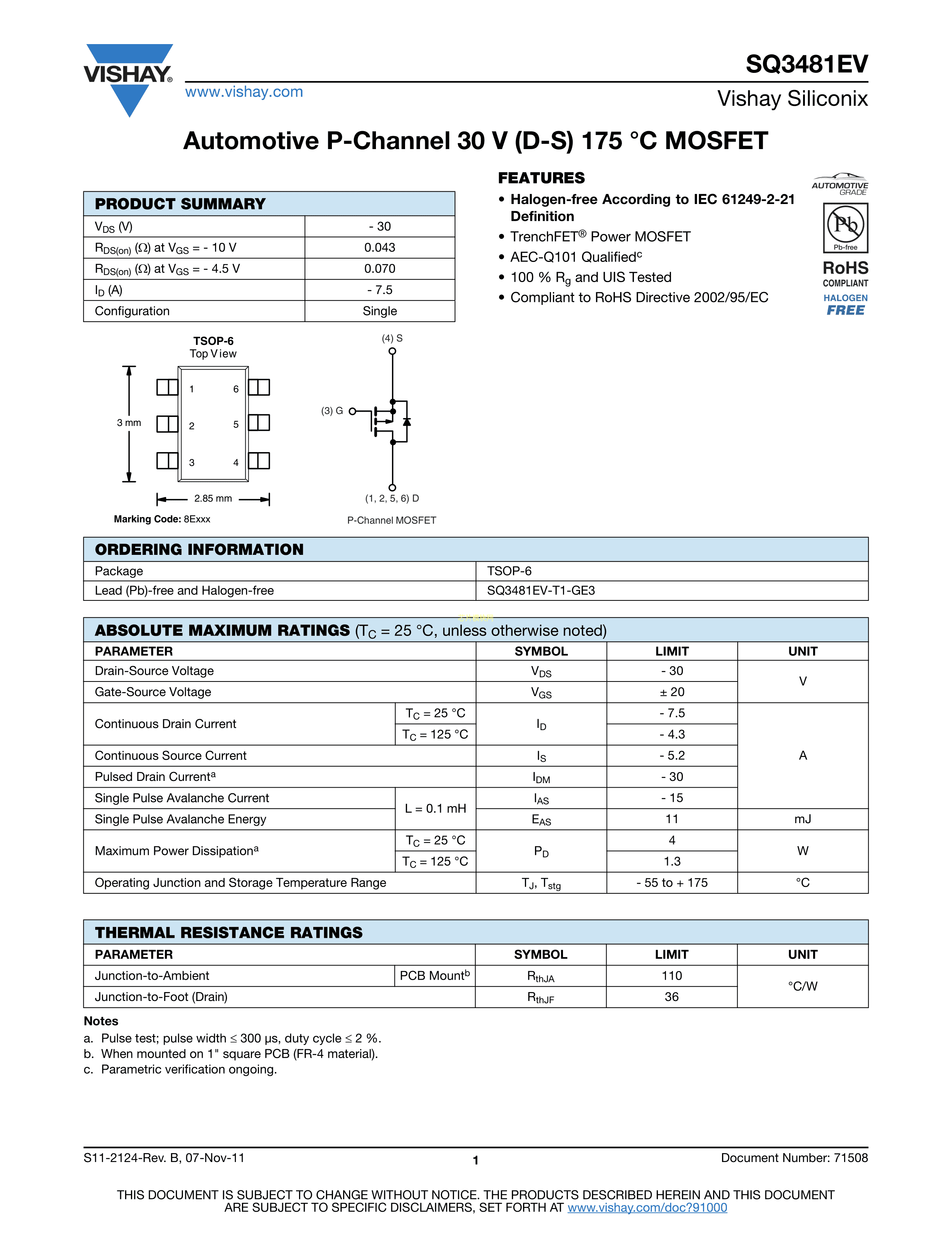 SQ3481EV-T1_GE3数据手册TSOP-6封装VISHAY(威世)PDF规格书,中英文下载