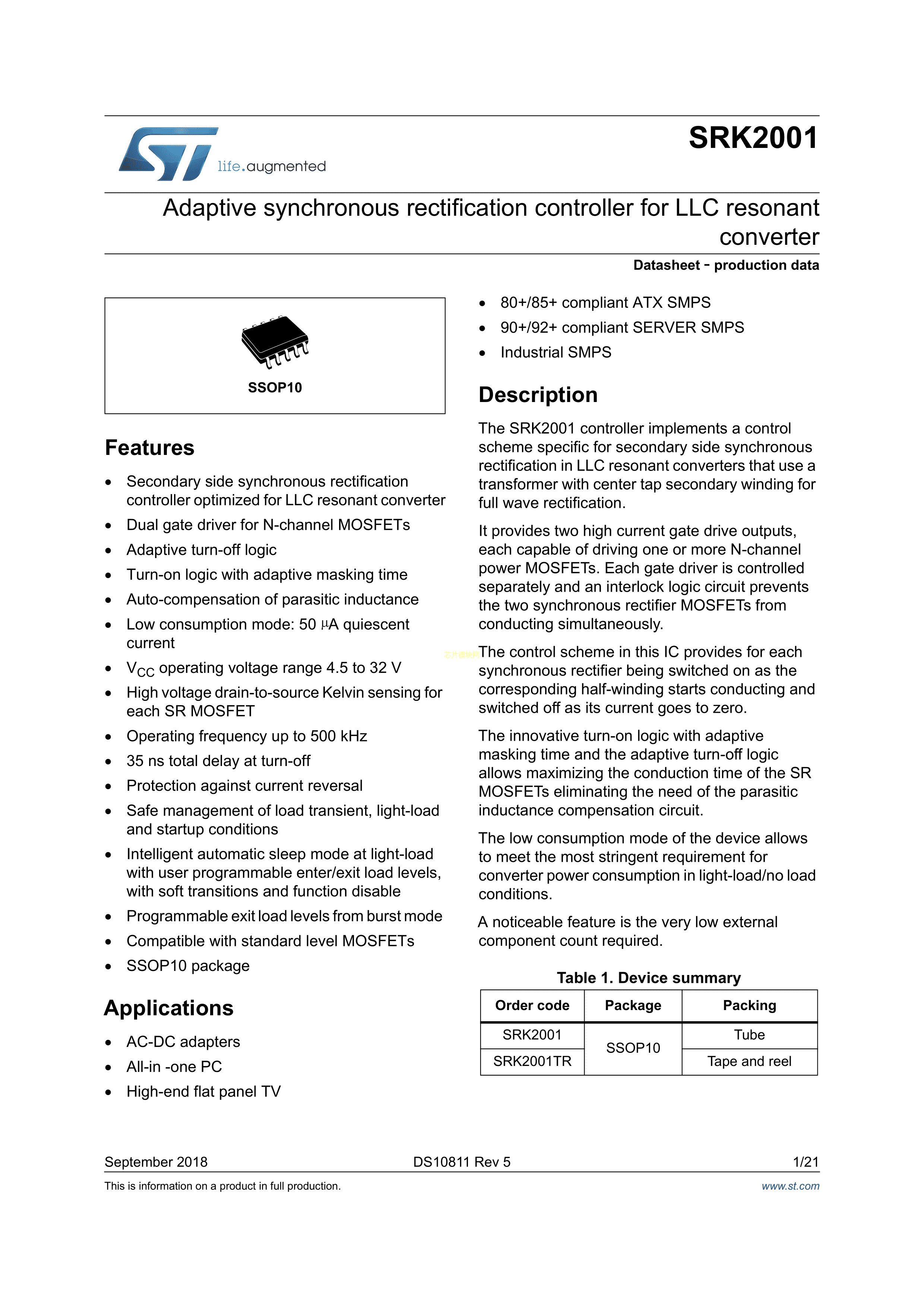 SRK2001数据手册SSOP-10封装ST(意法半导体)PDF规格书,中英文下载