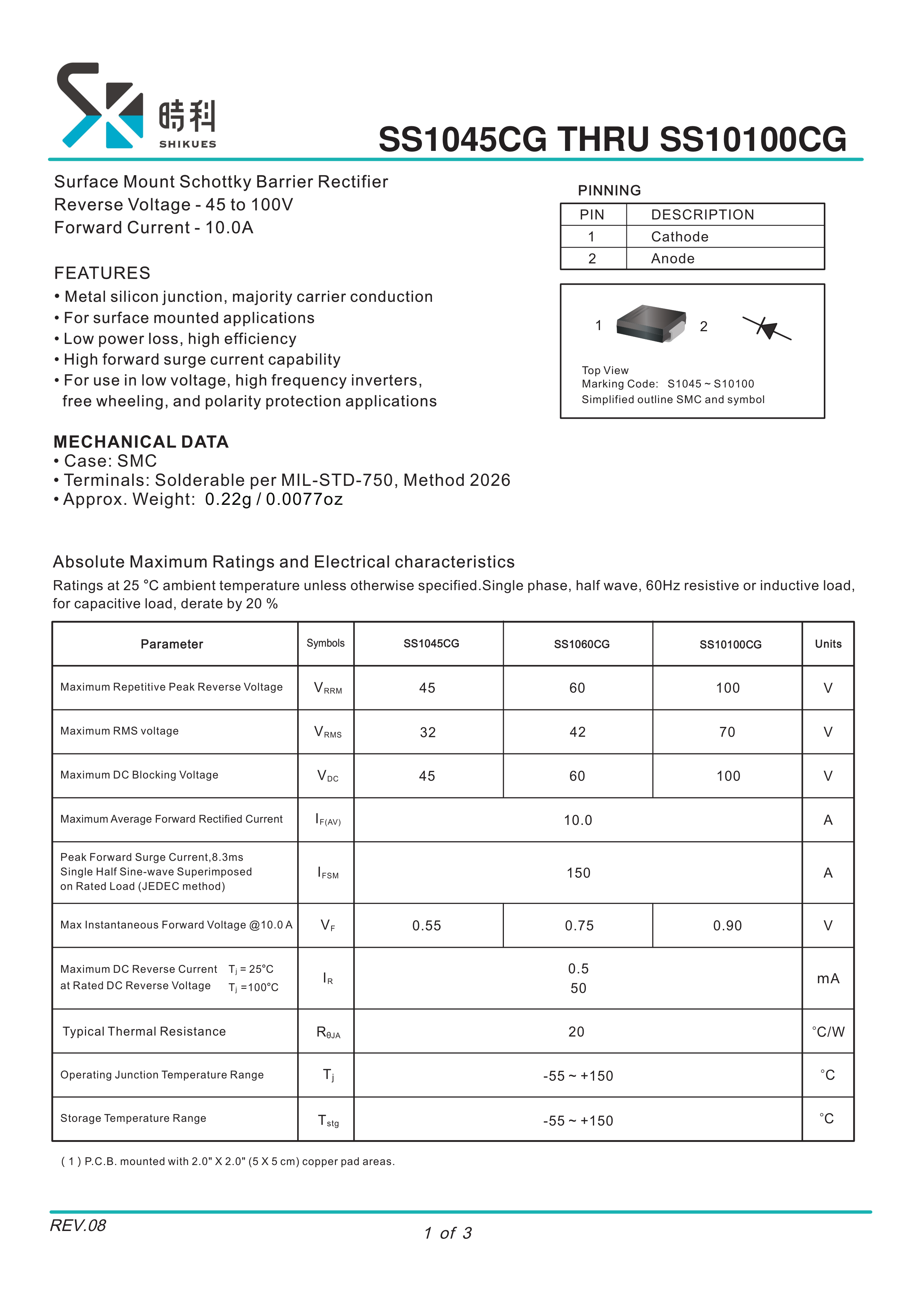 SS10100CG数据手册SMC封装SHIKUES(时科)PDF规格书,中英文下载