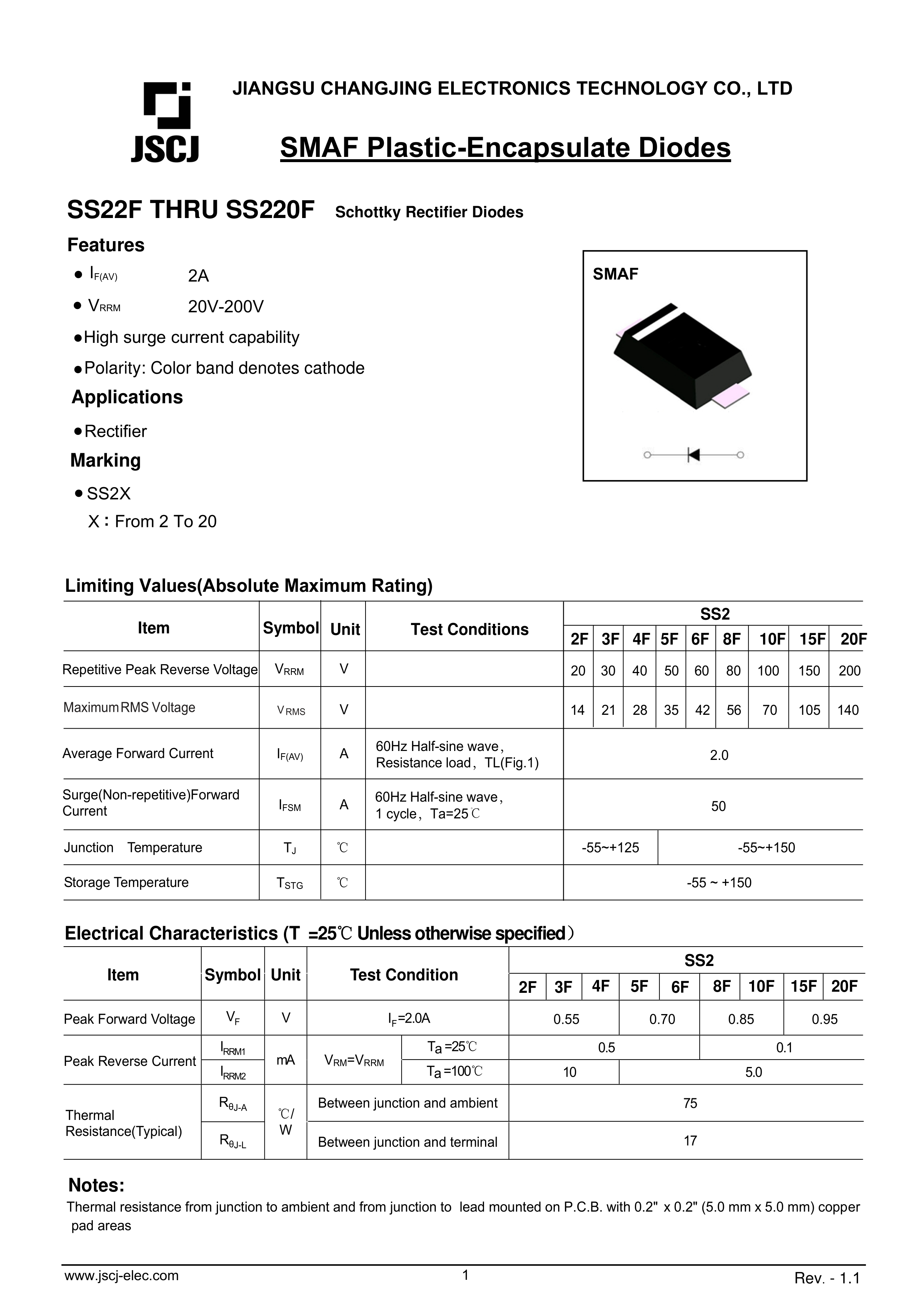 SS220F数据手册SMAF封装CJ(江苏长电-长晶)PDF规格书,中英文下载