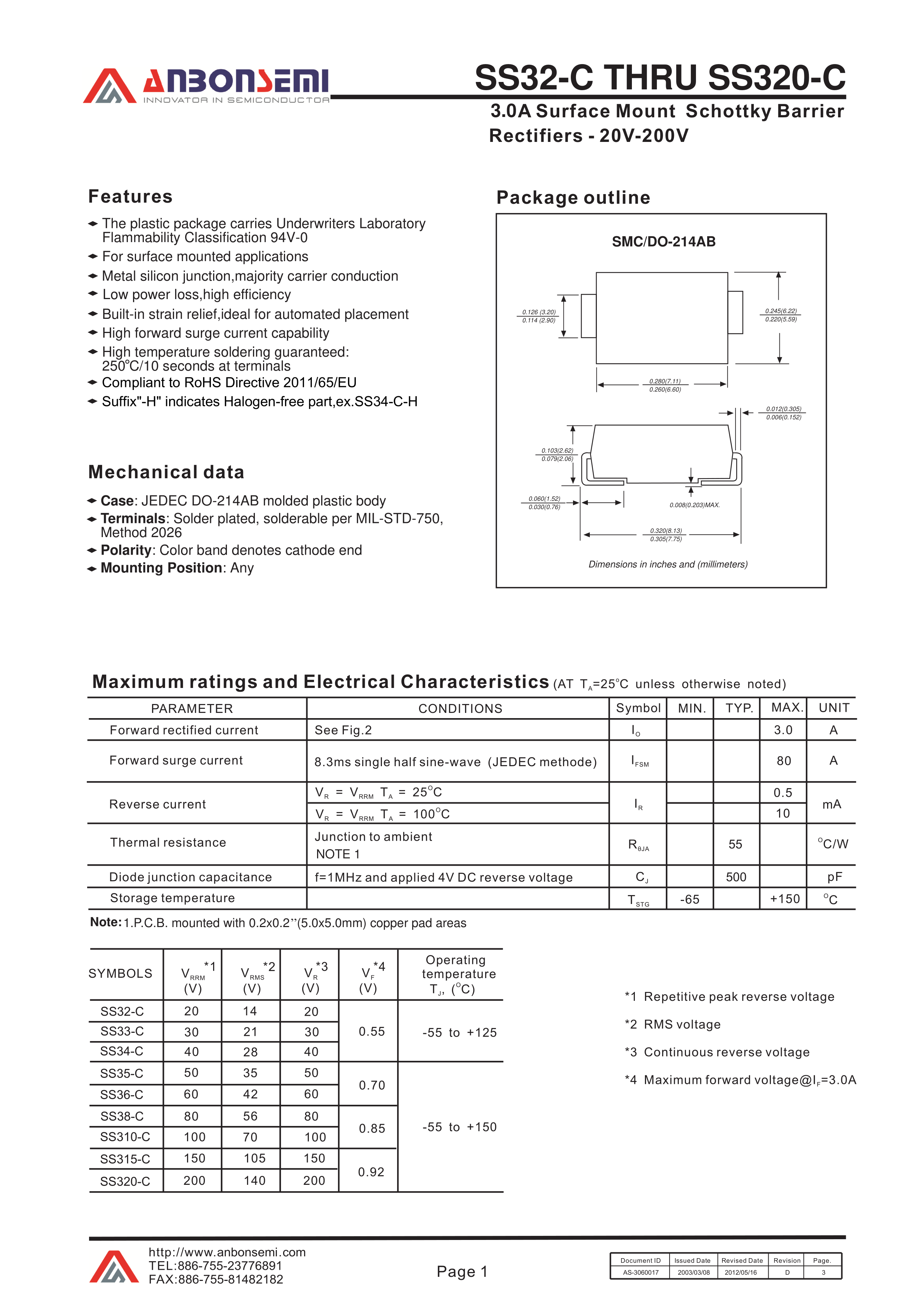 SS34-C数据手册SMC封装AnBon(台湾安邦)PDF规格书,中英文下载