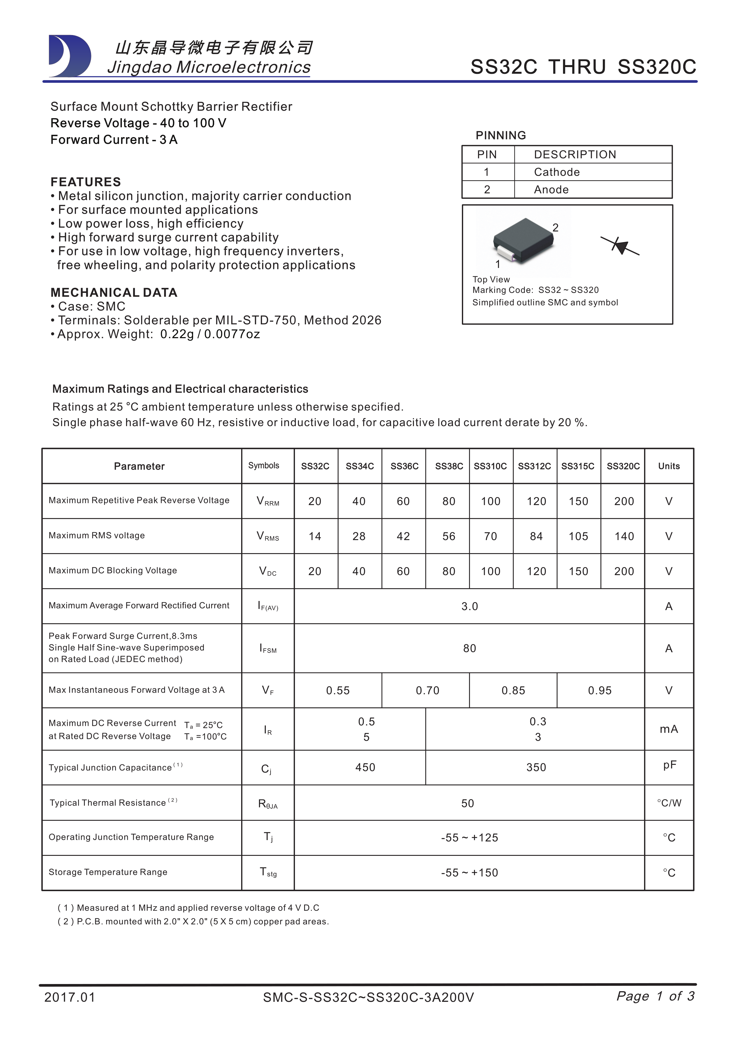 SS34C数据手册SMC(DO-214AB)封装晶导微电子PDF规格书,中英文下载