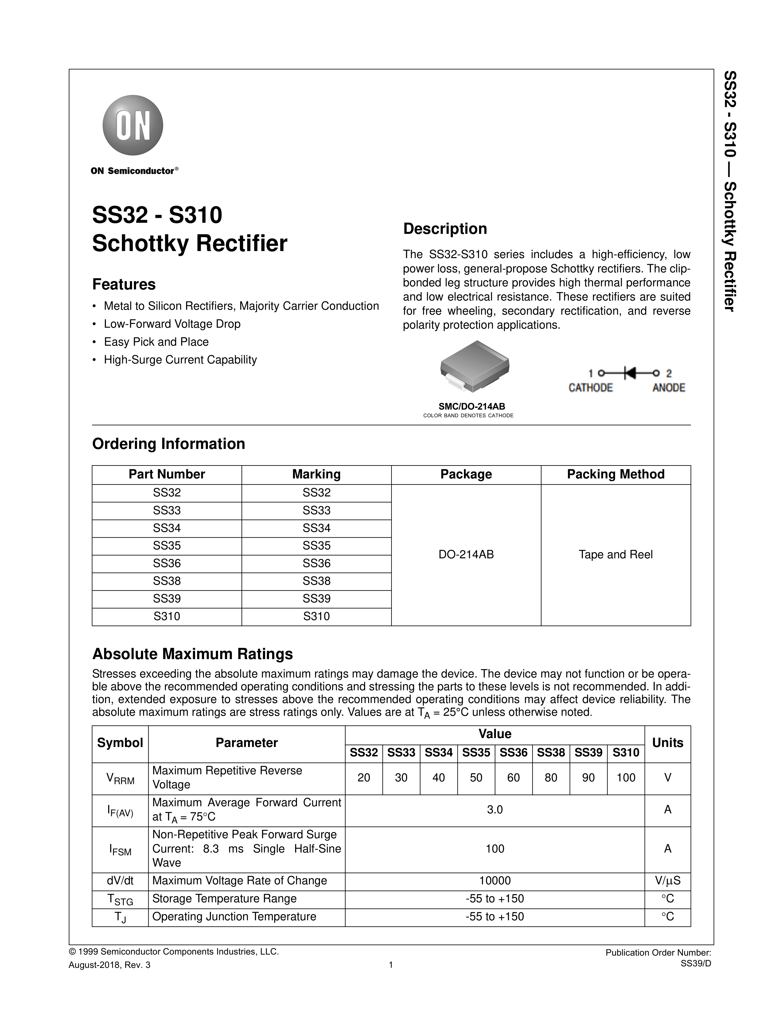 SS36数据手册SMC封装onsemi(安森美)PDF规格书,中英文下载