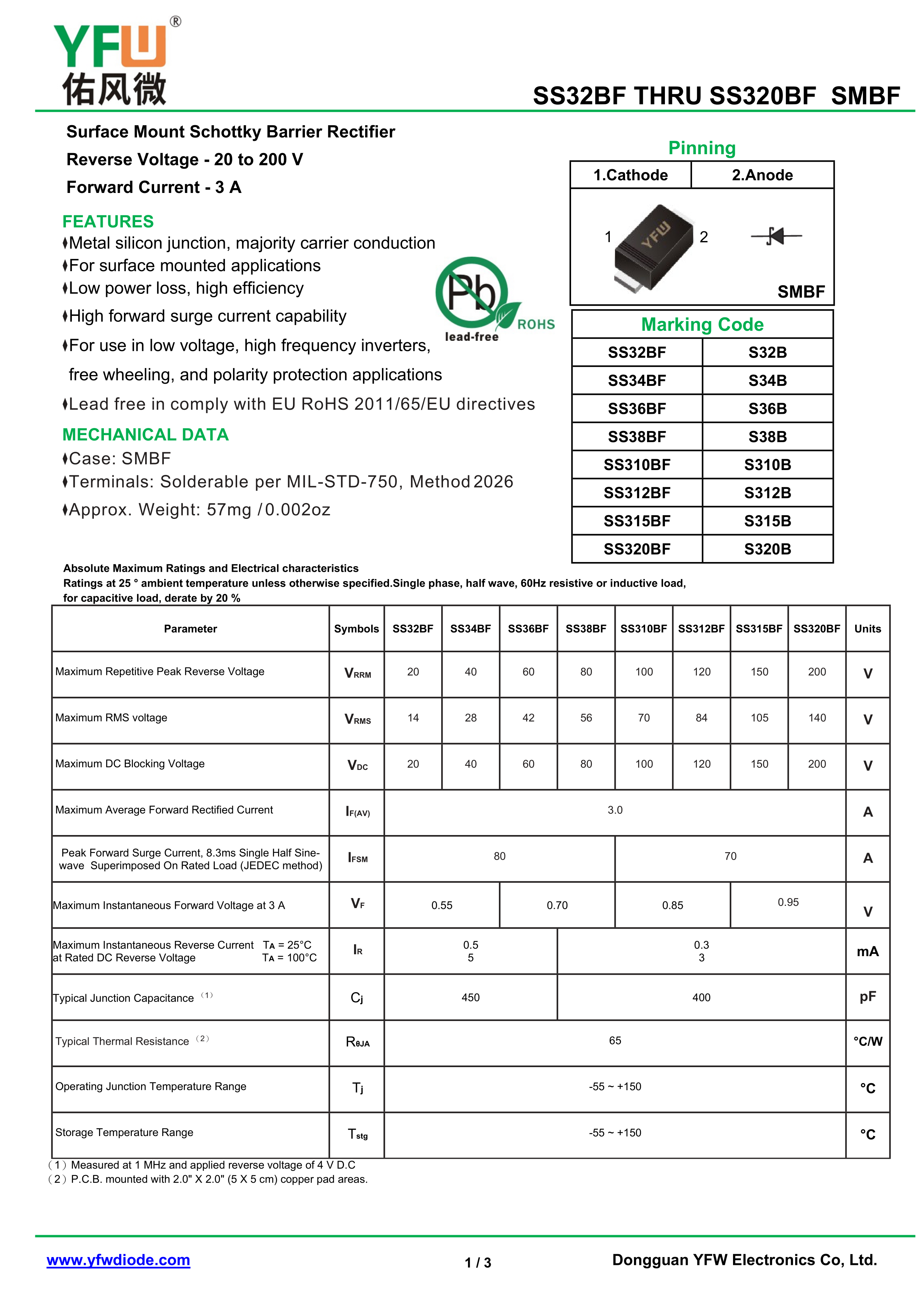 SS36BF数据手册SMBF封装YFW(佑风微)PDF规格书,中英文下载
