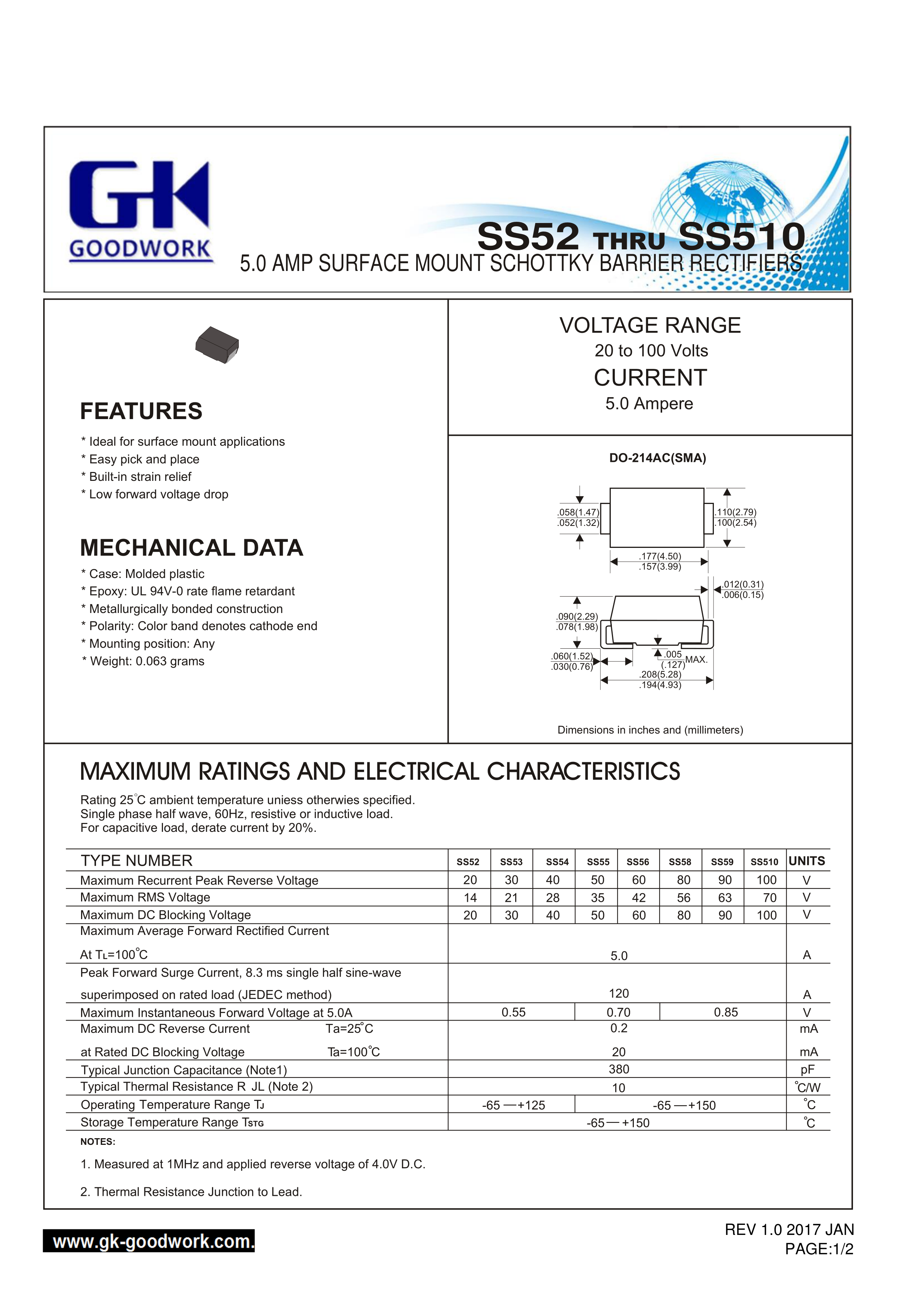 SS510数据手册SMA(DO-214AC)封装GOODWORK(固得沃克)PDF规格书,中英文下载