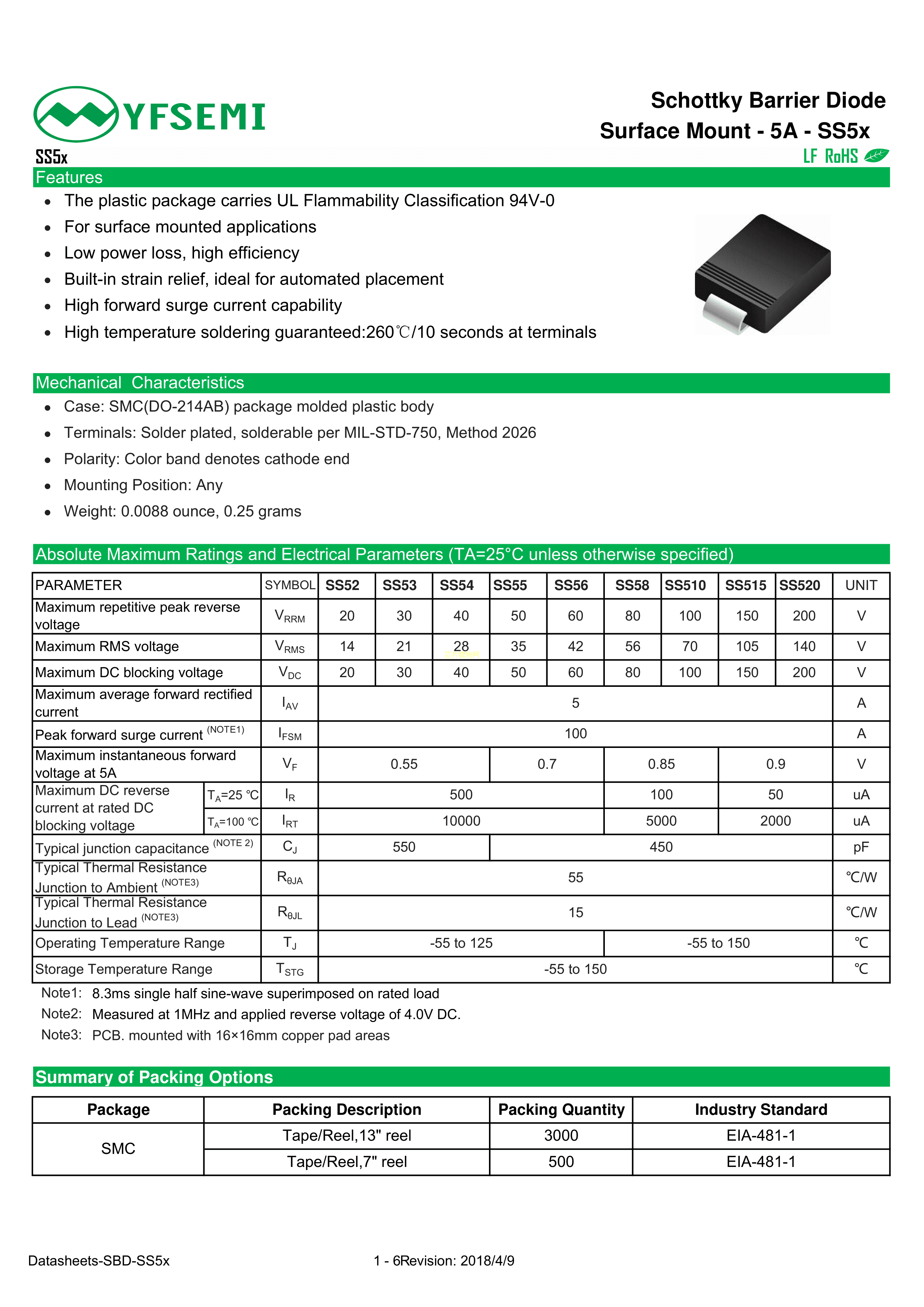 SS520数据手册SMC(DO-214AB)封装YFSEMI(江苏佑风微)PDF规格书,中英文下载