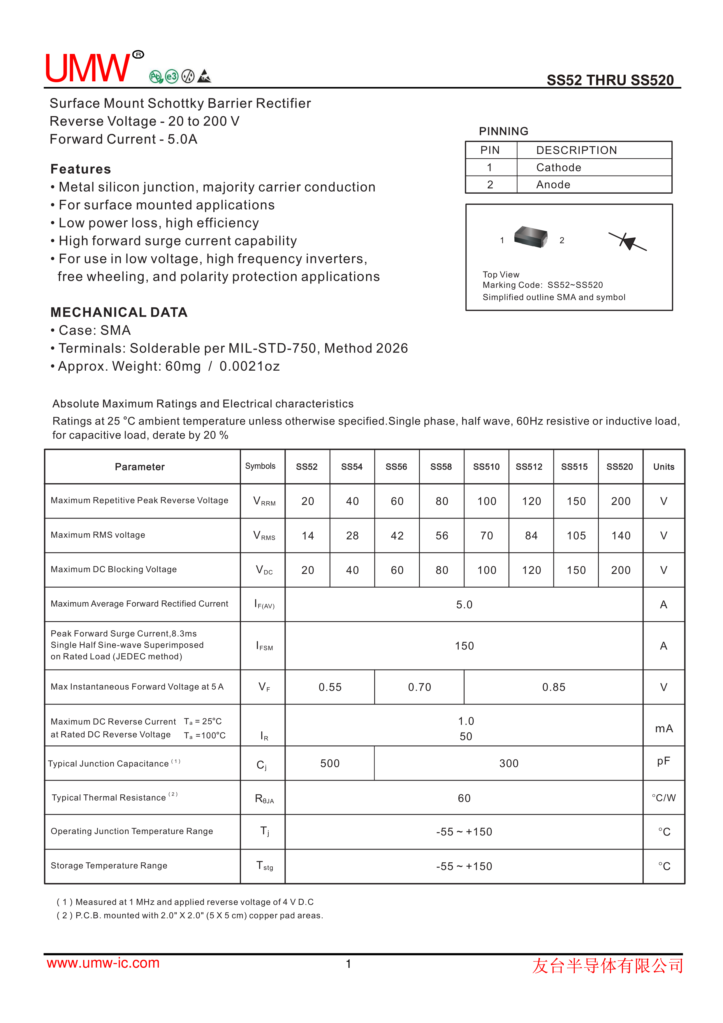 SS54数据手册SMA封装UMW(友台半导体)PDF规格书,中英文下载