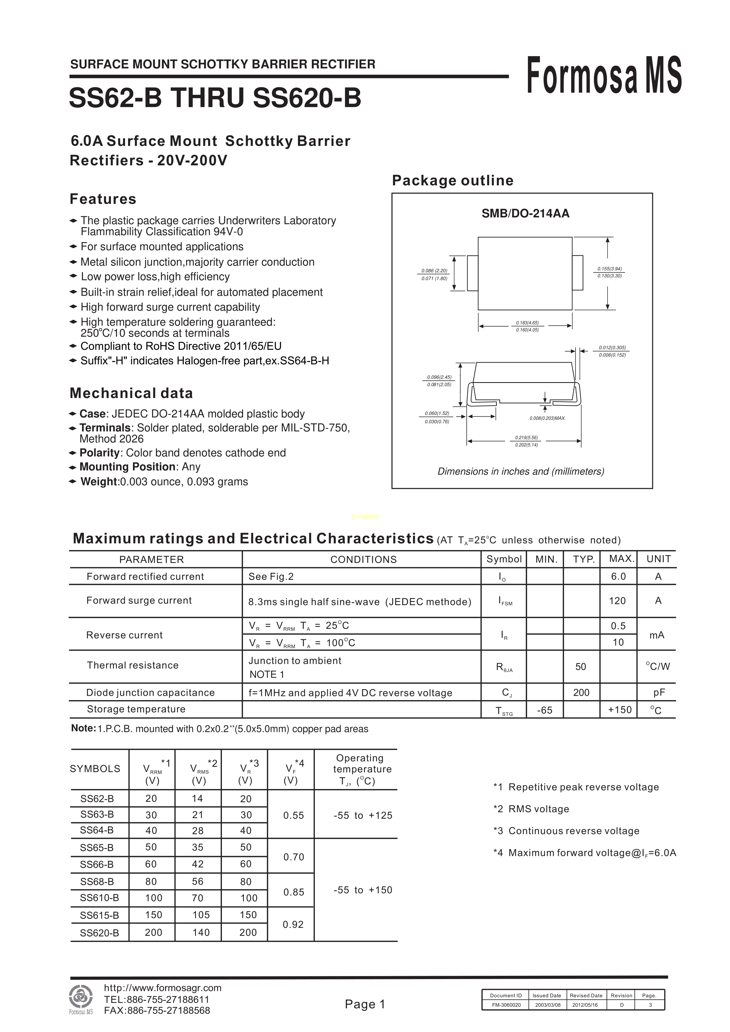 SS610-B数据手册SMB(DO-214AA)封装FMS(台湾美丽微)PDF规格书,中英文下载