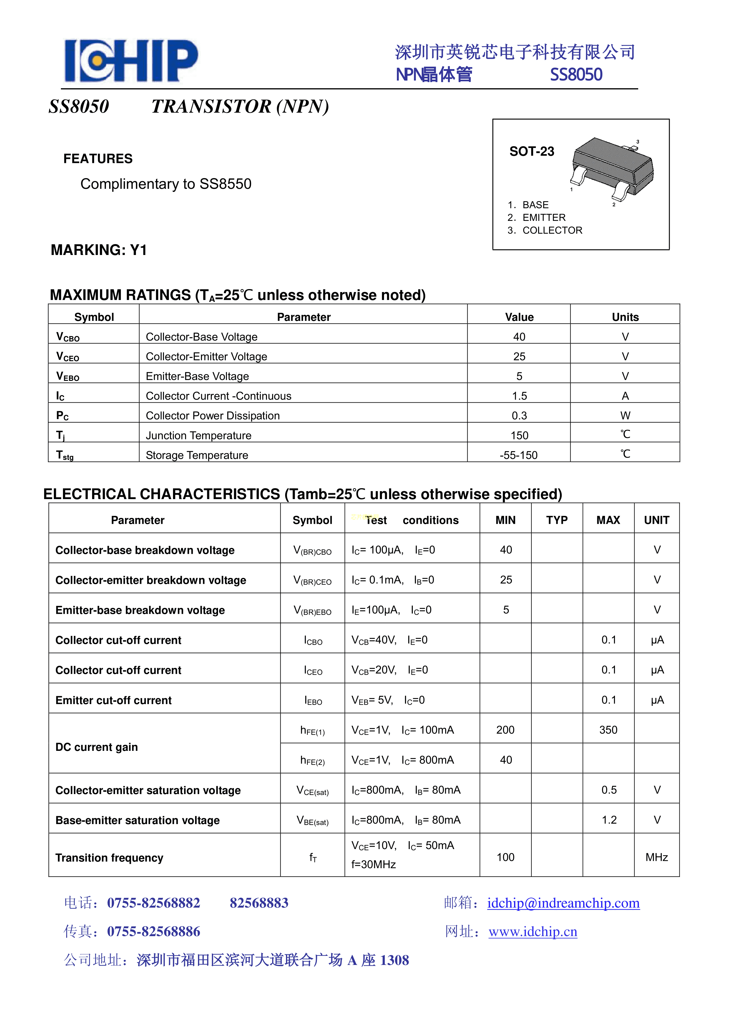 SS8050数据手册SOT-23封装IDCHIP(英锐芯)PDF规格书,中英文下载