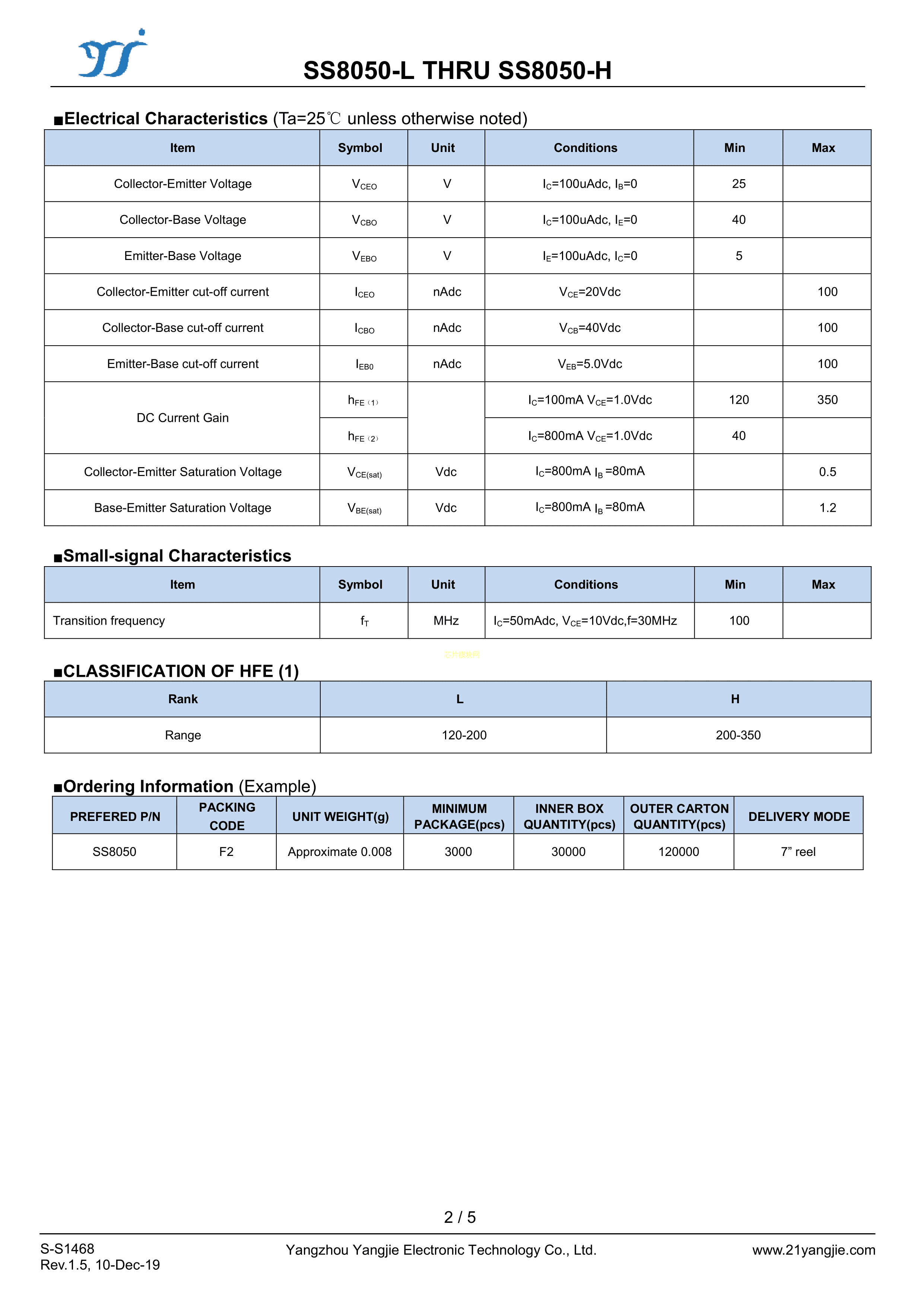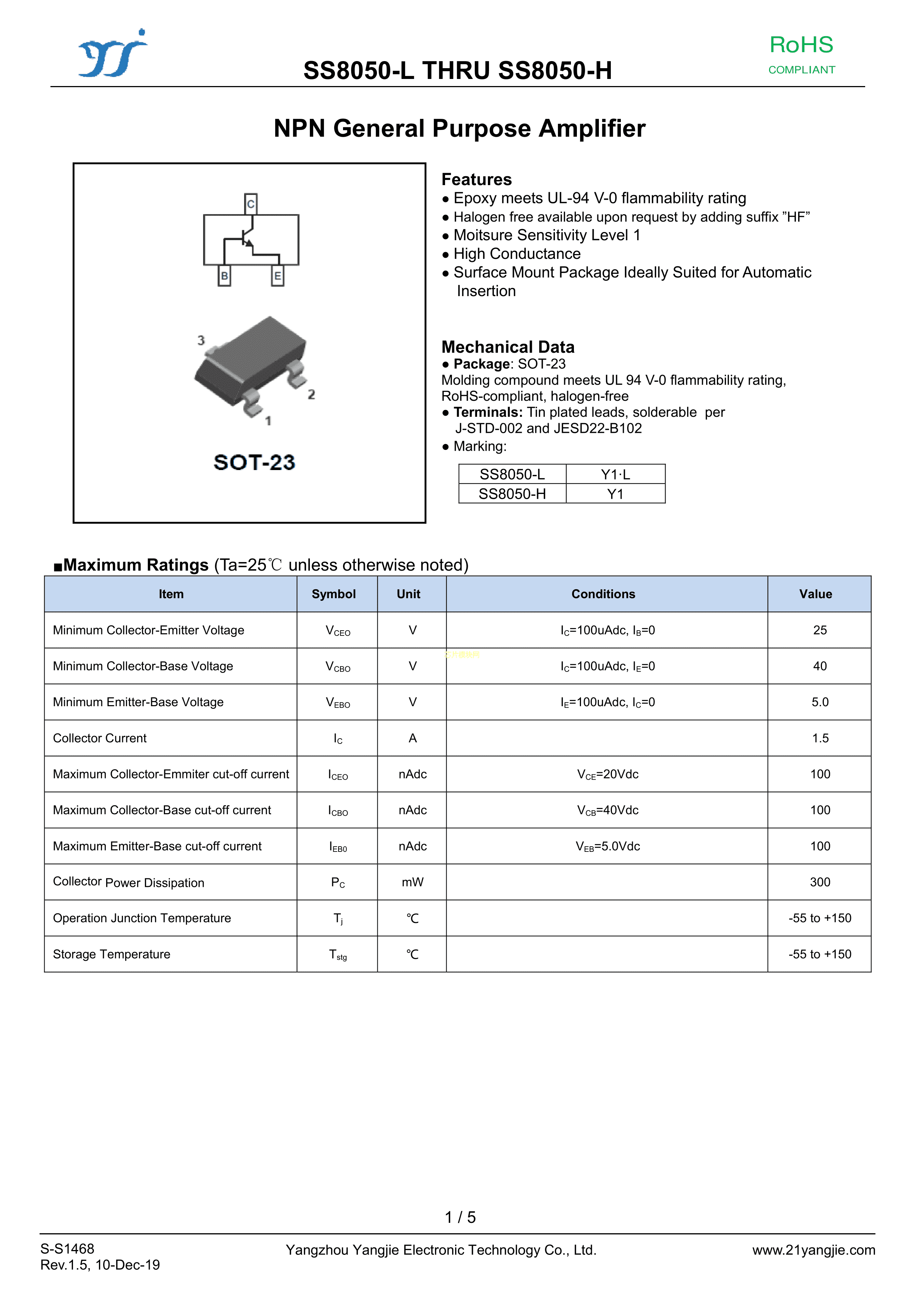 SS8050-H数据手册SOT-23-3L封装YANGJIE(扬杰)PDF规格书,中英文下载