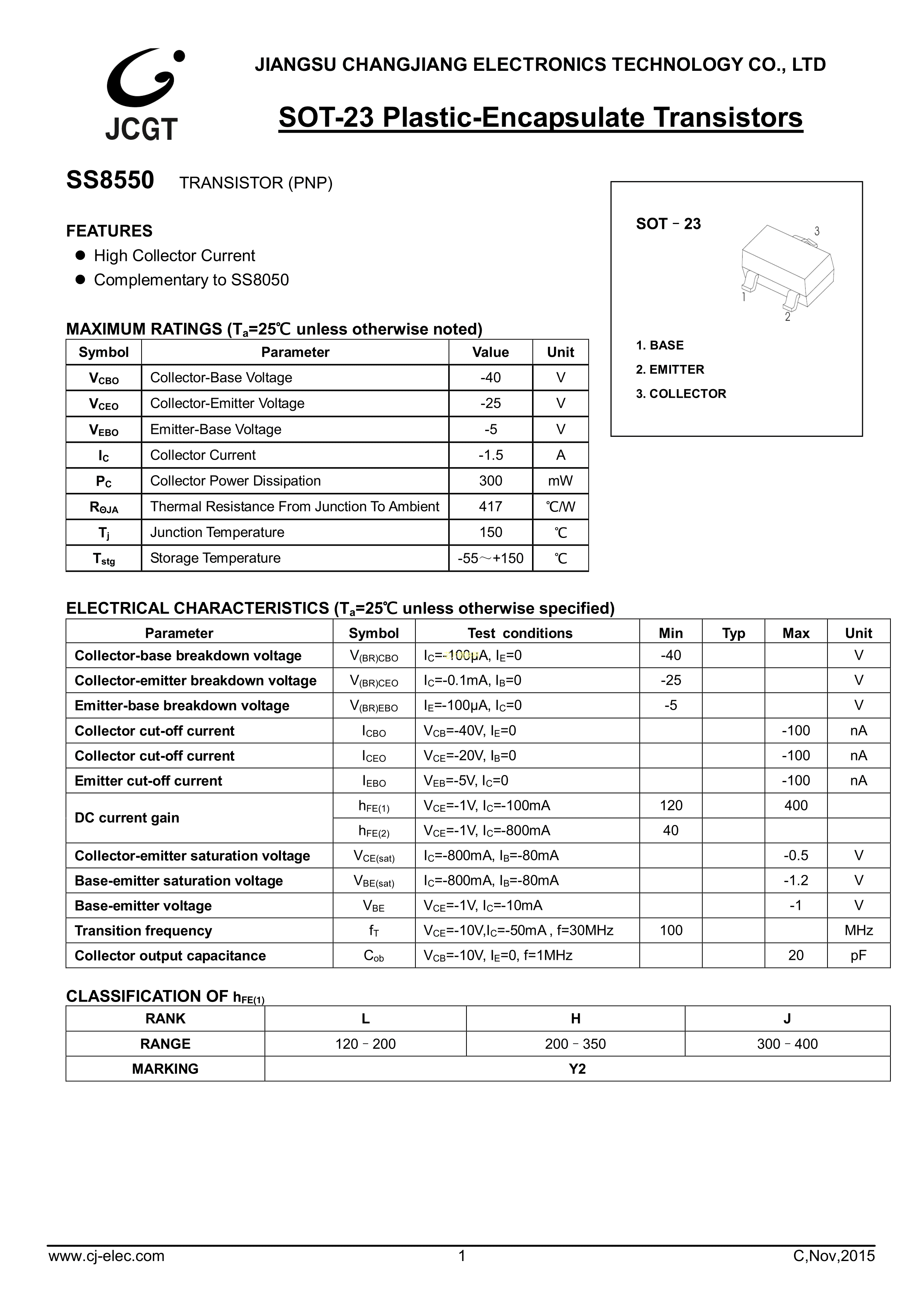 SS8550数据手册SOT-23(SOT-23-3)封装CJ(江苏长电-长晶)PDF规格书,中英文下