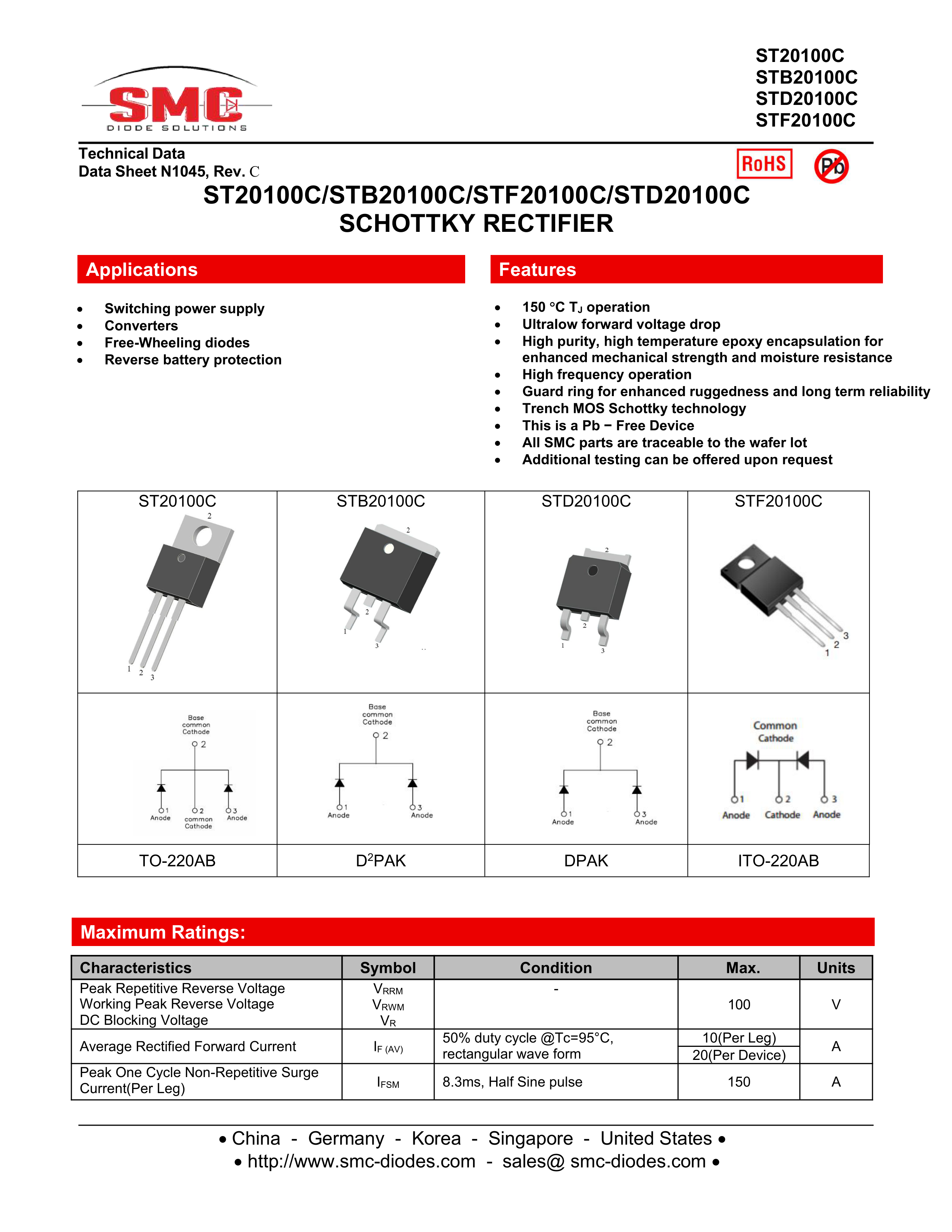 ST20100C数据手册TO-220AB封装SMC(桑德斯)PDF规格书,中英文下载