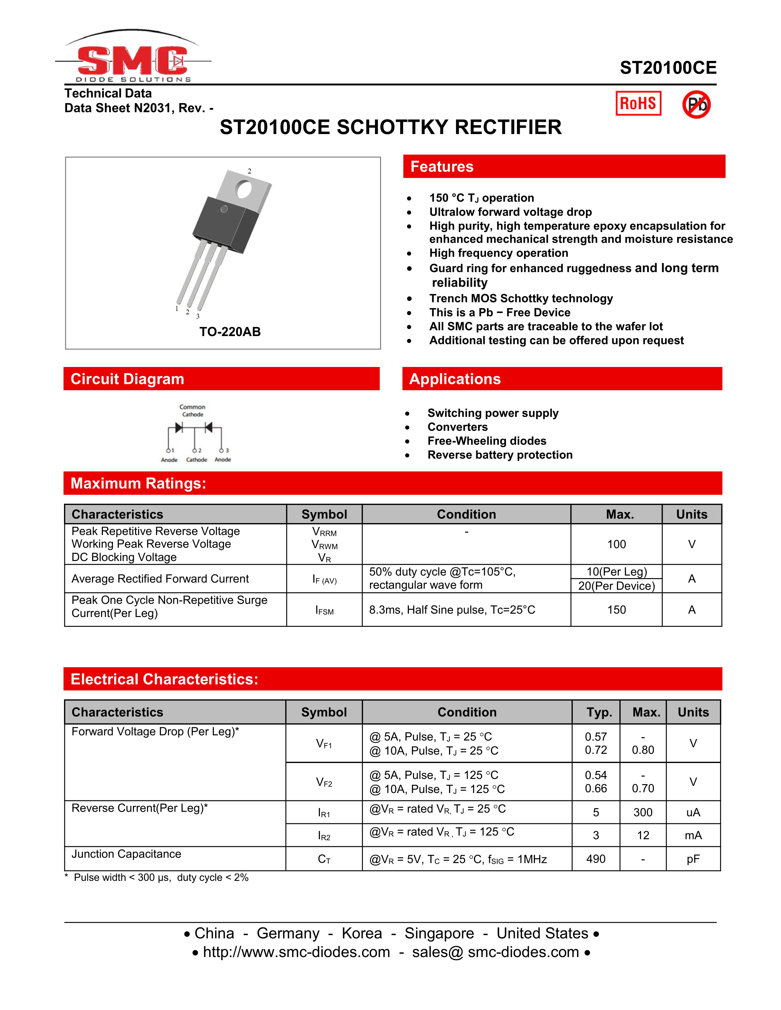ST20100CE数据手册TO-220AB封装SMC(桑德斯)PDF规格书,中英文下载