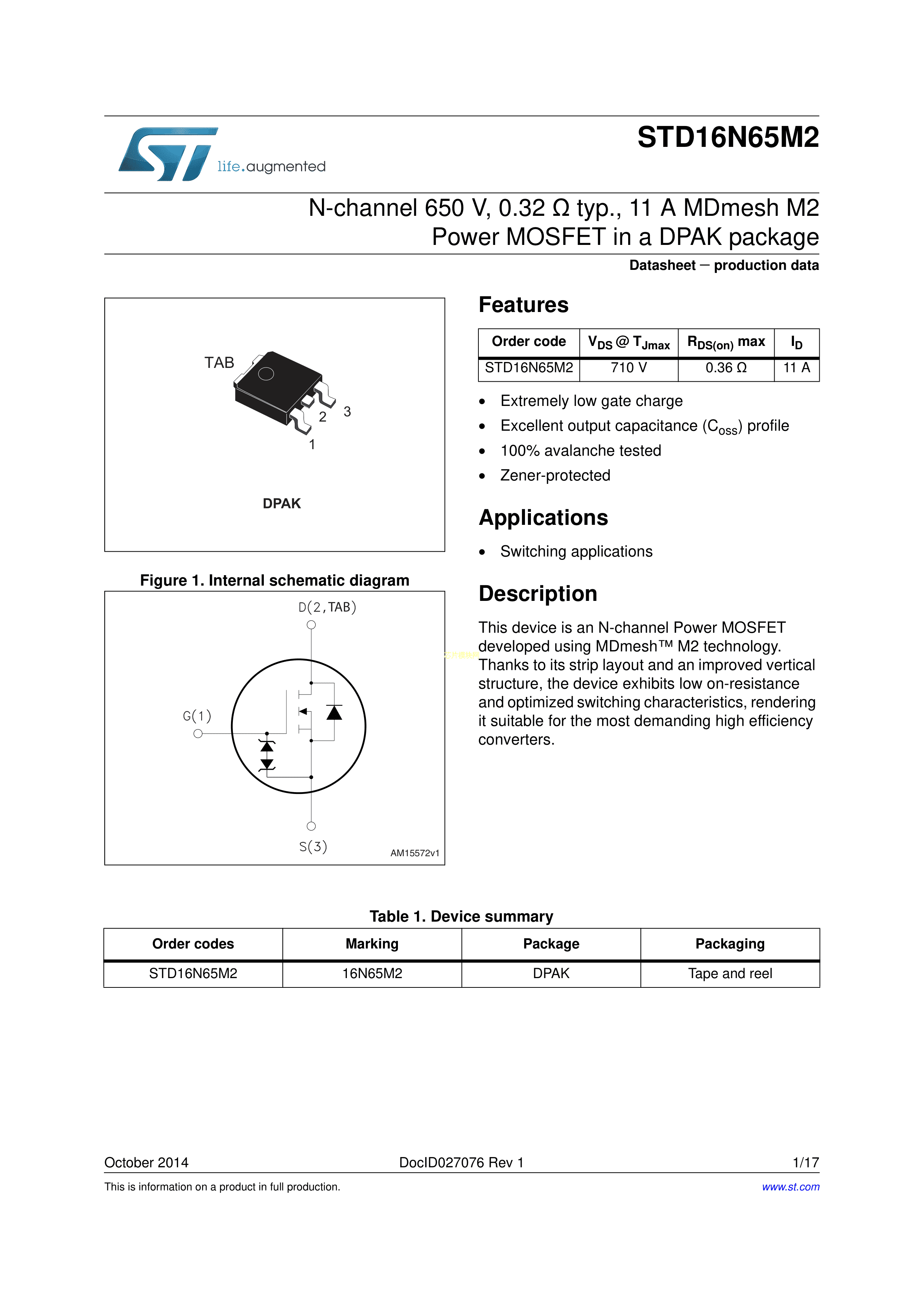 STD16N65M2数据手册DPAK封装ST(意法半导体)PDF规格书,中英文下载
