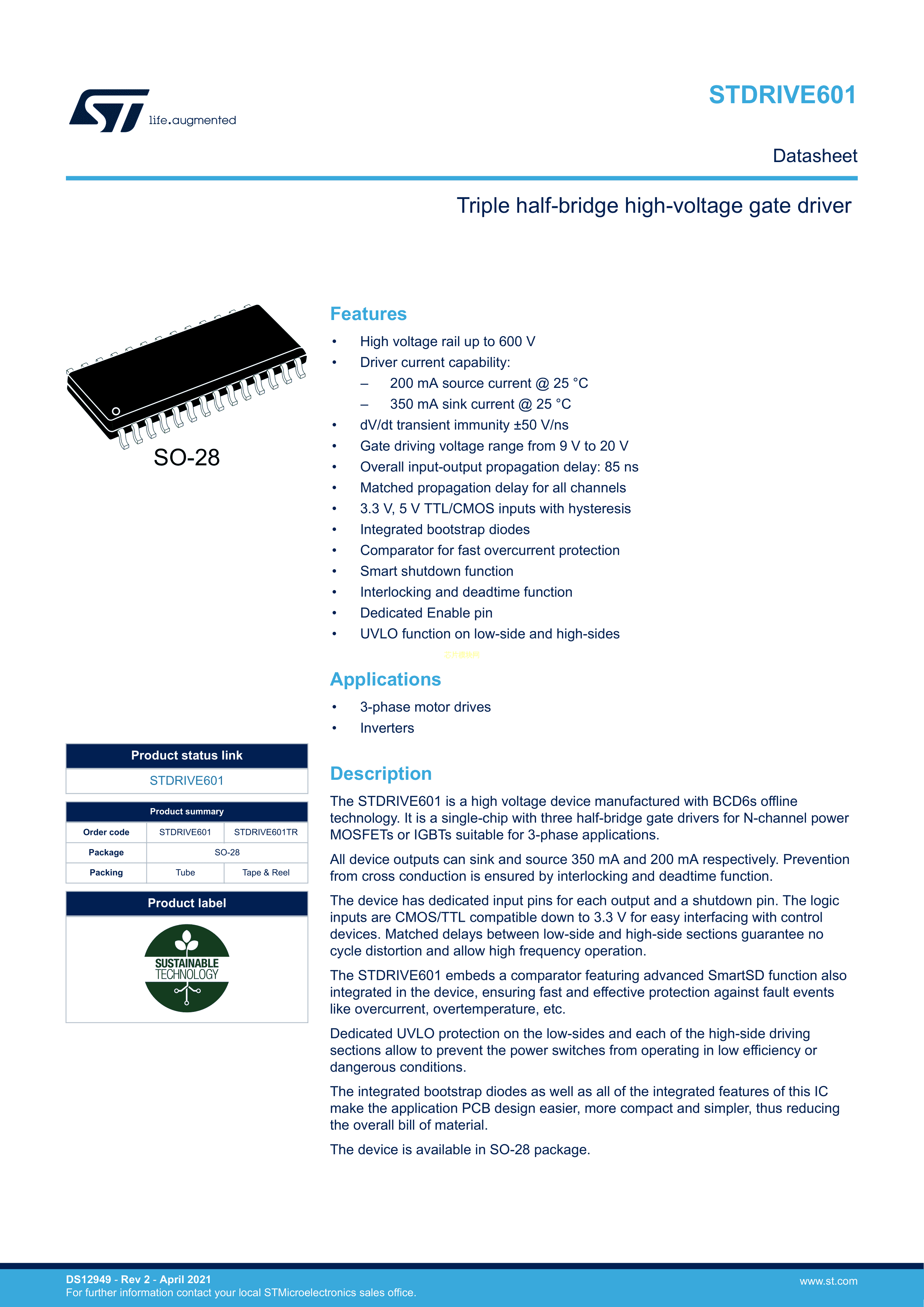 STDRIVE601数据手册SO-28封装ST(意法半导体)PDF规格书,中英文下载