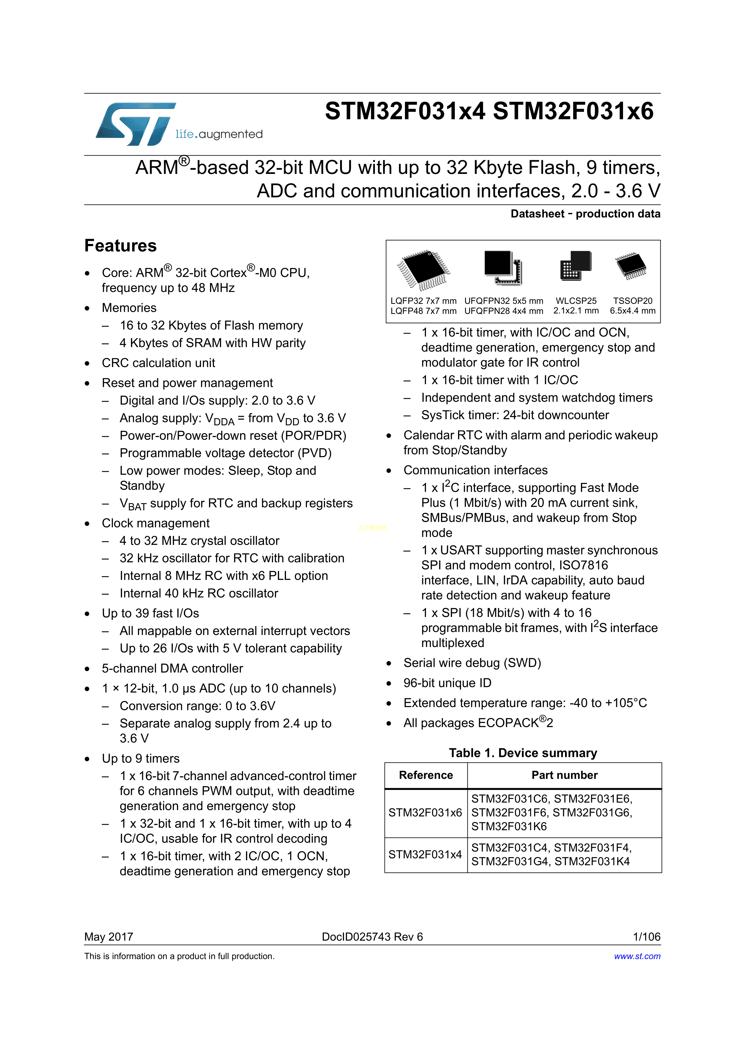 STM32F031C4T6TR数据手册LQFP-48(7x7)封装ST(意法半导体)PDF规格书,中